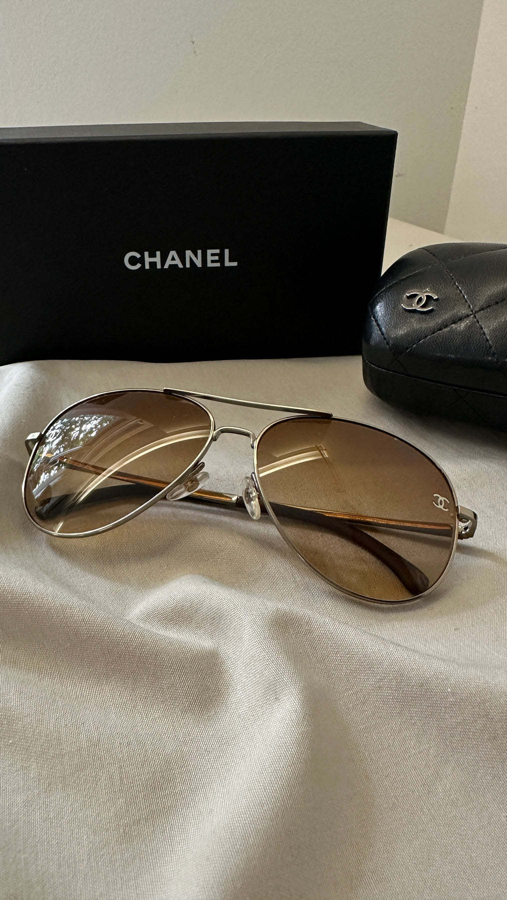 Dieses Modell von Chanel präsentiert sich im zeitlosen Aviator-Stil mit feinem Rahmen und ikonischem Design. Die Kombination aus klassischer Form und modernen Details macht sie zu einem stilvollen Begleiter für jede Saison.