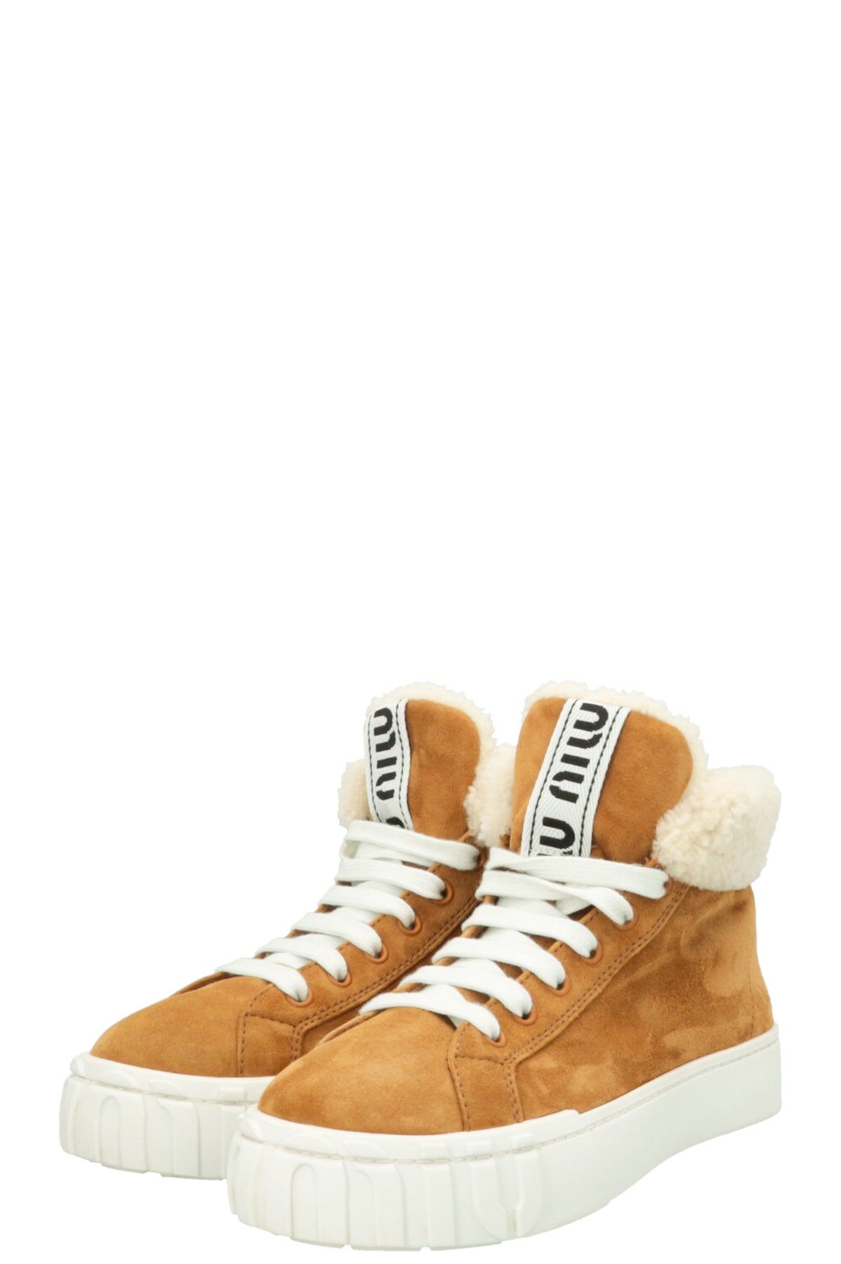 MIUMIU Logo High Top Shearling Sneakers Suede Beige