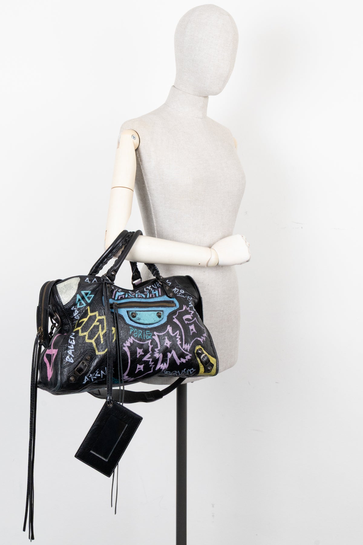 Die Balenciaga Graffiti City Tote Bag in Schwarz ist eine rebellische Neuinterpretation der ikonischen City Bag, bei der Street-Art-Ästhetik mit dem Design der Tasche verbunden wird. Das weiche, geschmeidige Leder wird mit handgemalten Graffiti-Prints versehen, die der Tasche einen urbanen, lässigen und einzigartigen Look verleihen.