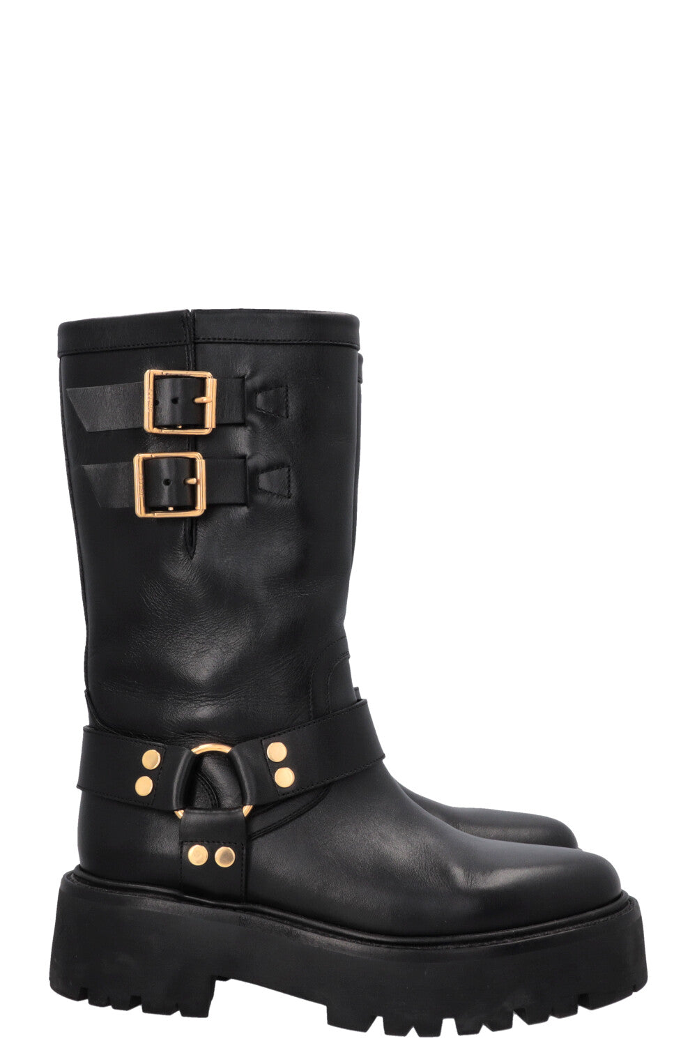 Die CÉLINE Biker Boots in Schwarz zeigen eine kraftvolle Silhouette mit rohen Akzenten und gleichzeitig sauberem Finish. Aus glattem Leder gefertigt überzeugen sie durch ihre robuste Struktur und feste Form, ideal für markante Outfits. Zwei seitliche Schnallen dienen nicht nur zur Justierung, sondern auch als markanter Akzent, was dem Boot einen edlen Touch verleiht, sichtbar, aber nicht überladen.