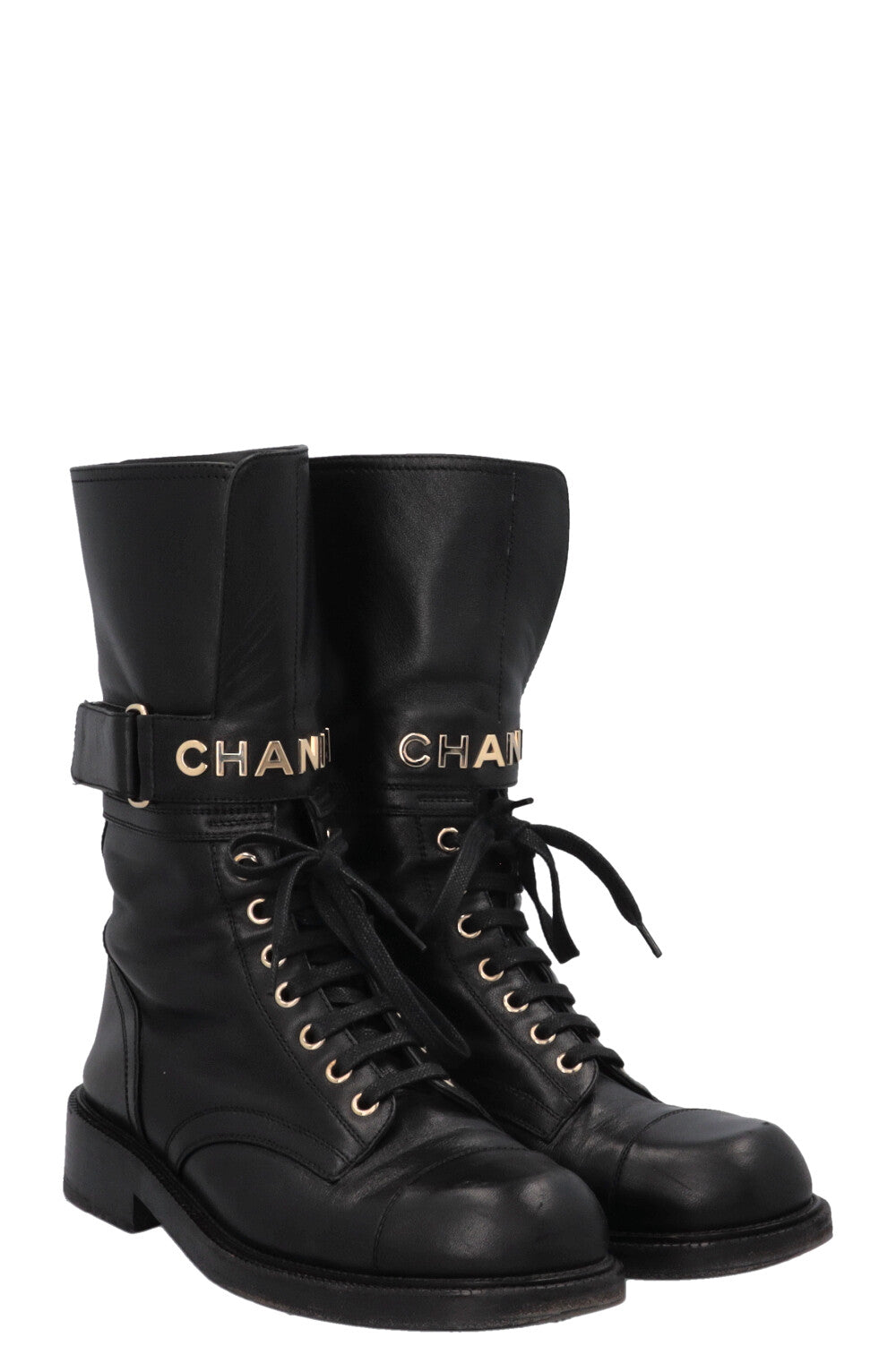 CHANEL 2022 Lace Up Logo Biker Boots Leather Black