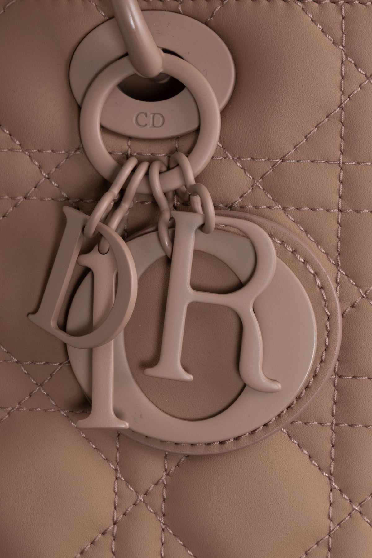 Die sanfte Nude-Farbgebung wirkt dezent und vielseitig, während das Kalbsleder mit matter Oberfläche die grafische Steppung besonders klar hervorhebt. Die abgerundeten Henkel und die schmalen Metallanhänger setzen die typischen Dior-Codes in einem zurückhaltenden Ton fort.
