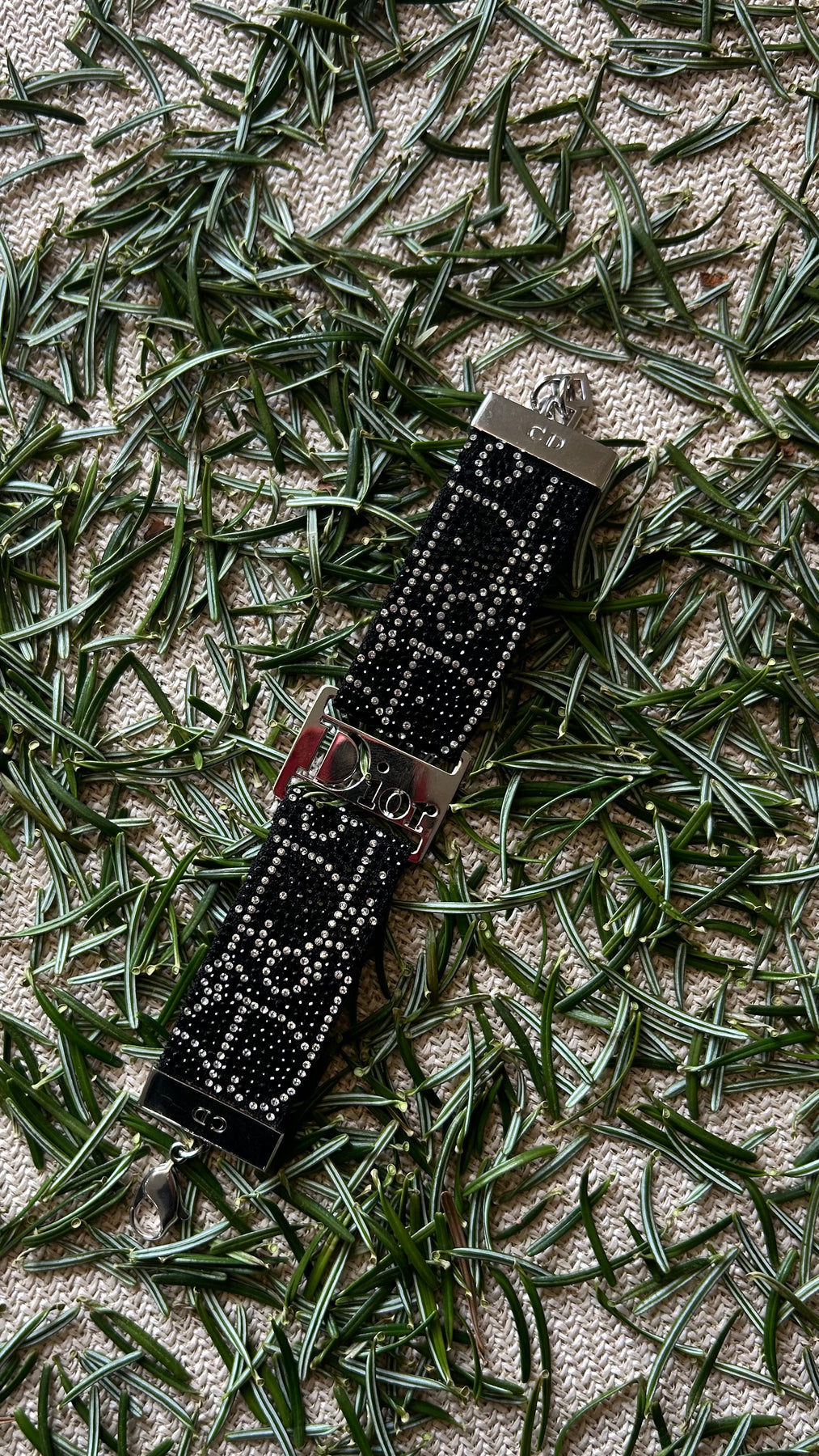 Elegantes Armband aus schwarzem Leder, verziert mit dem ikonischen Dior-Oblique-Motiv und funkelnden Strass-Details in Silber. Ein stilvolles Accessoire, das jedem Outfit eine moderne und edle Note verleiht – der perfekte Begleiter für einen Hauch von Glamour im Alltag.