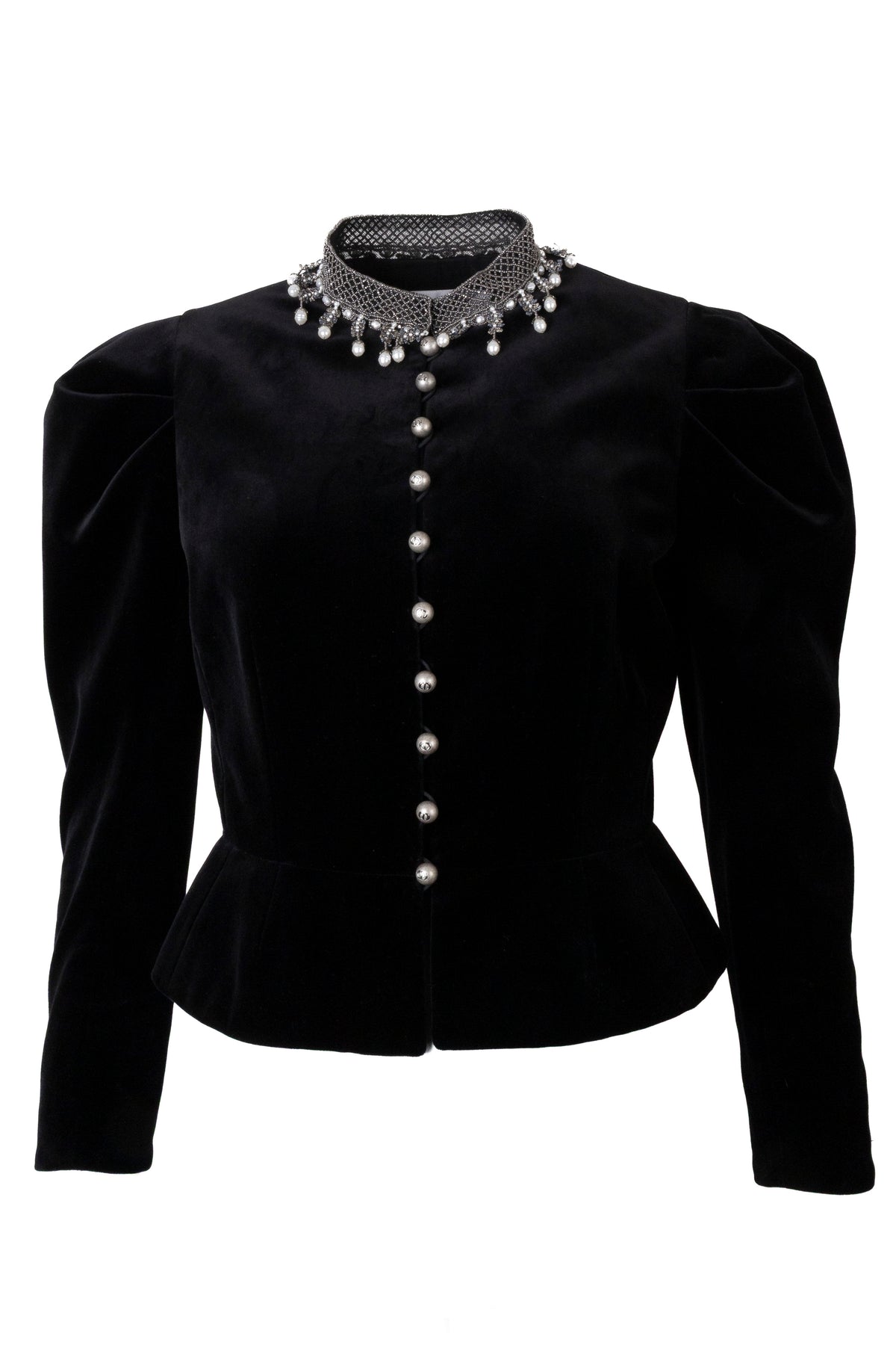 Mithilfe des Couture-Spirits der Maison zelebriert die bei der Cruise 2025 Fashion Show präsentierte Jacke die Symbole der Eleganz von Maria Stuart, die gleichzeitig das Hauptthema der Kollektion bilden. Die Cropped-Silhouette mit figurbetonter Passform aus schwarzem Baumwollsamt verfügt über einen bestickten Offizierskragen und voluminöse Puffärmel. Der Dior Tribales Knopfverschluss mit CD Kunstharzperlen erinnert an den berühmten Ohrring der Maison und sorgt für einen eleganten Couture-Touch. Dieses Modell ist aktuell noch nicht bei Dior verfügbar.