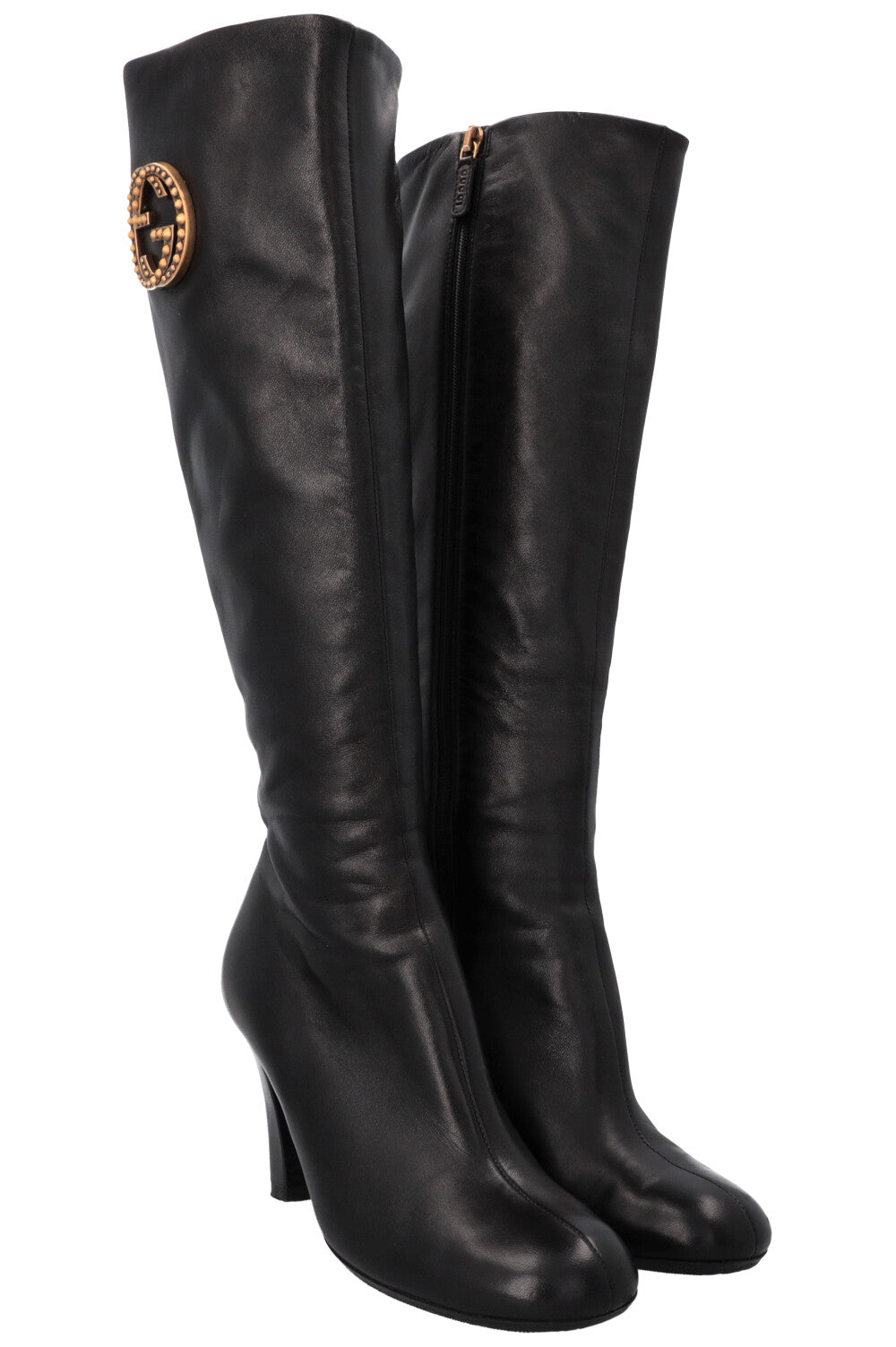 Diese schwarzen Gucci Boots überzeugen mit ihrem klassischen Design und hochwertigem Leder. Das goldfarbene GG Logo auf der Seite setzt einen edlen Akzent und verleiht dem Schuh einen ikonischen Touch. Ob zur Jeans oder zum Kleid, diese Stiefeletten lassen sich vielseitig kombinieren. Ein stilvoller Begleiter für jeden Tag
