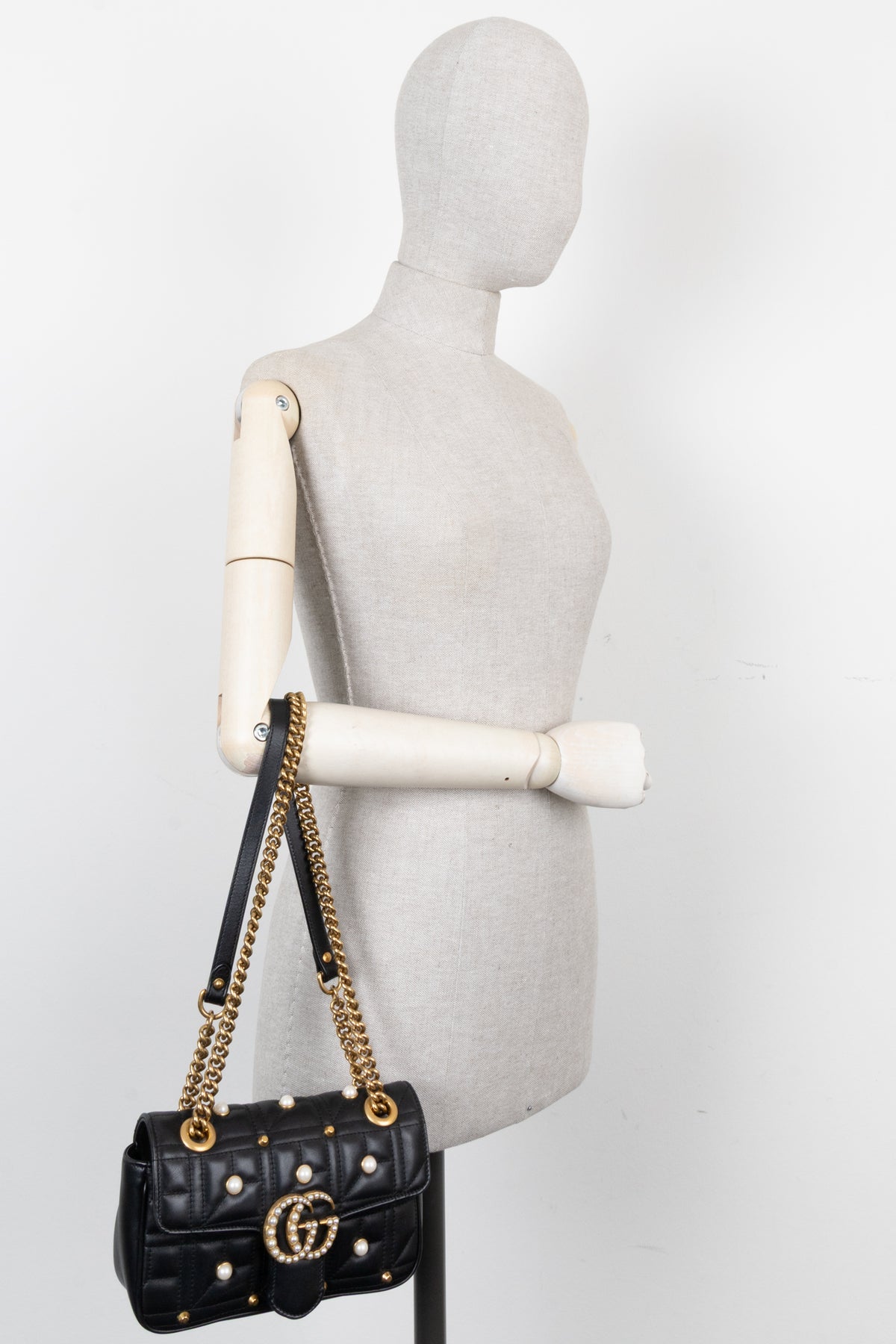Zeitlos und vielseitig: Die schwarze Gucci Small Marmont Camera Bag aus matelassé-gestepptem Leder kombiniert das ikonische GG-Logo in Gold, das hier mit zarten Perlendetails veredelt ist. Kompakt und dennoch geräumig ist sie der perfekte Begleiter für stilvolle Looks von Tag bis Nacht.