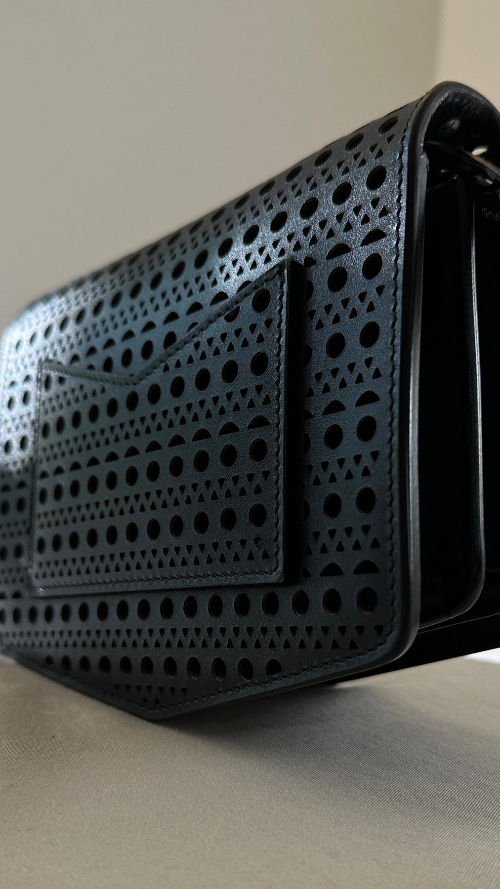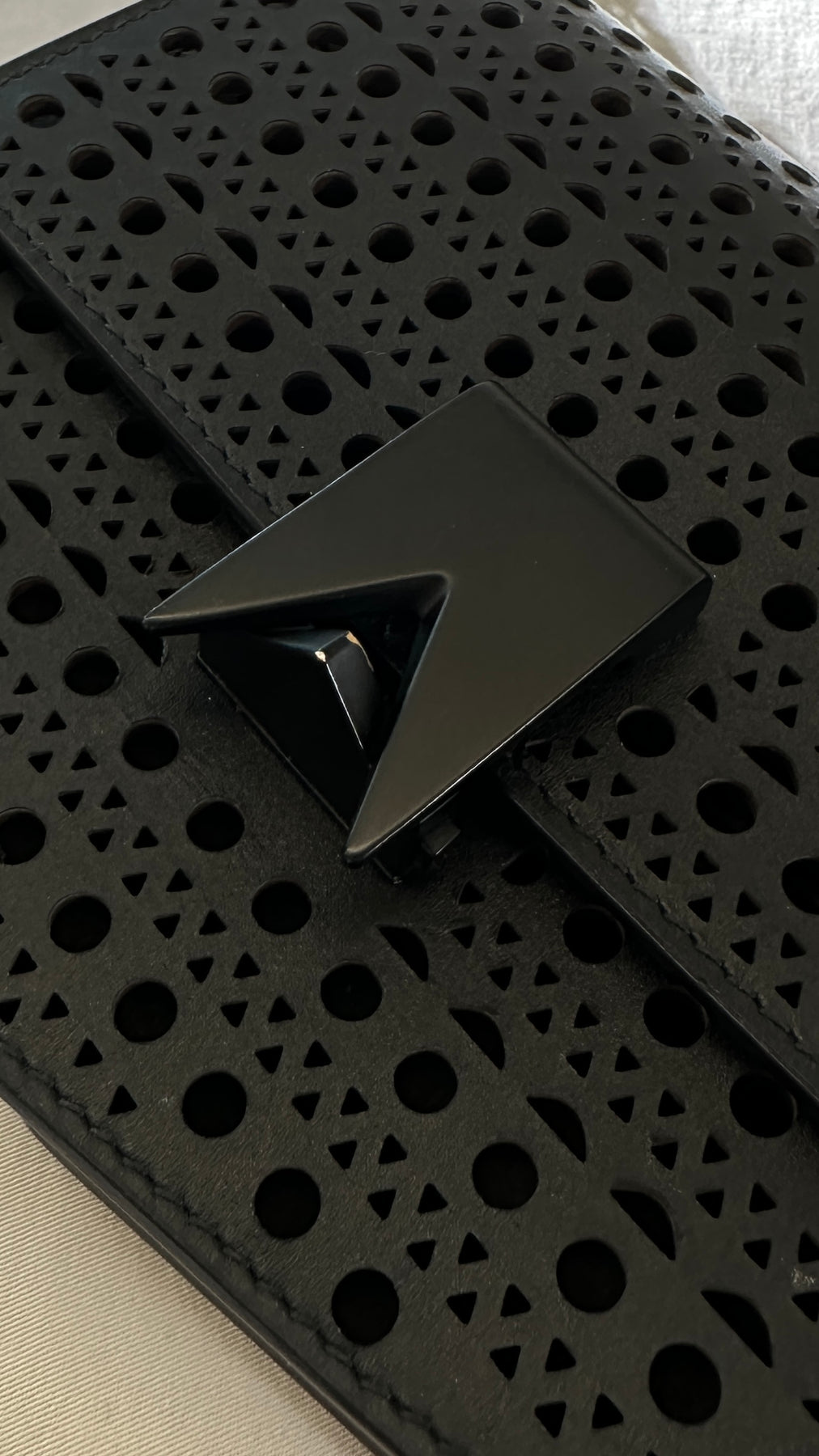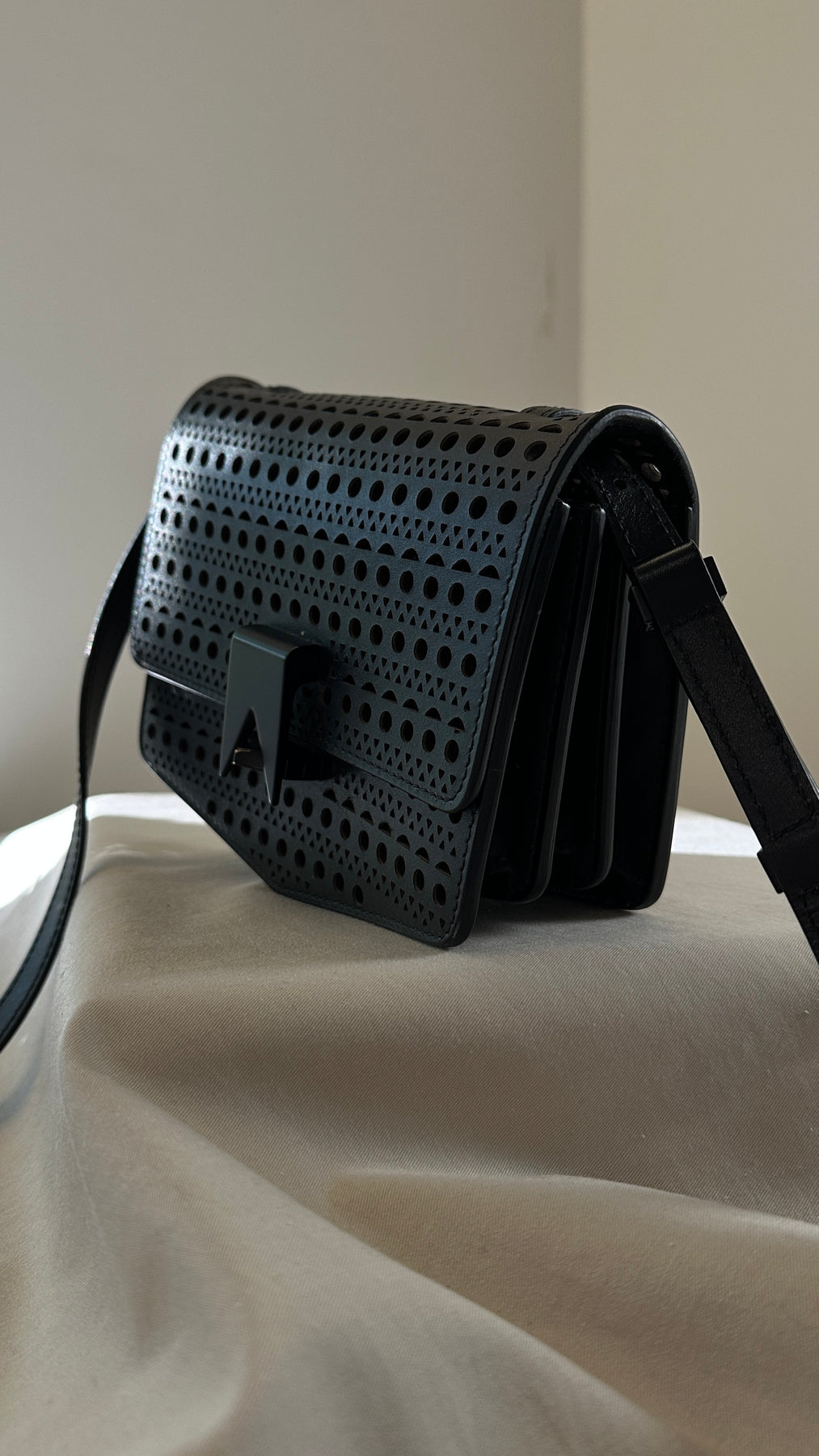 Kompakte Le Papa Small Vienne Tasche in Schwarz. Feine Cut-out-Details und klare Linien machen sie zu einem zeitlosen Begleiter. Mit verstellbare Riemen.
