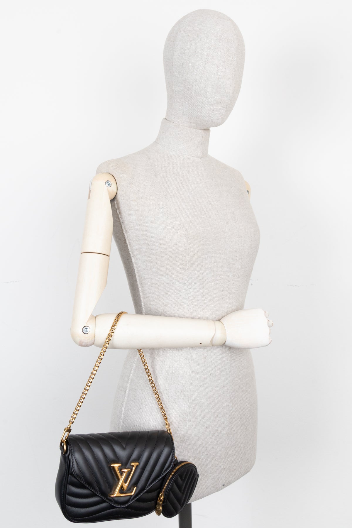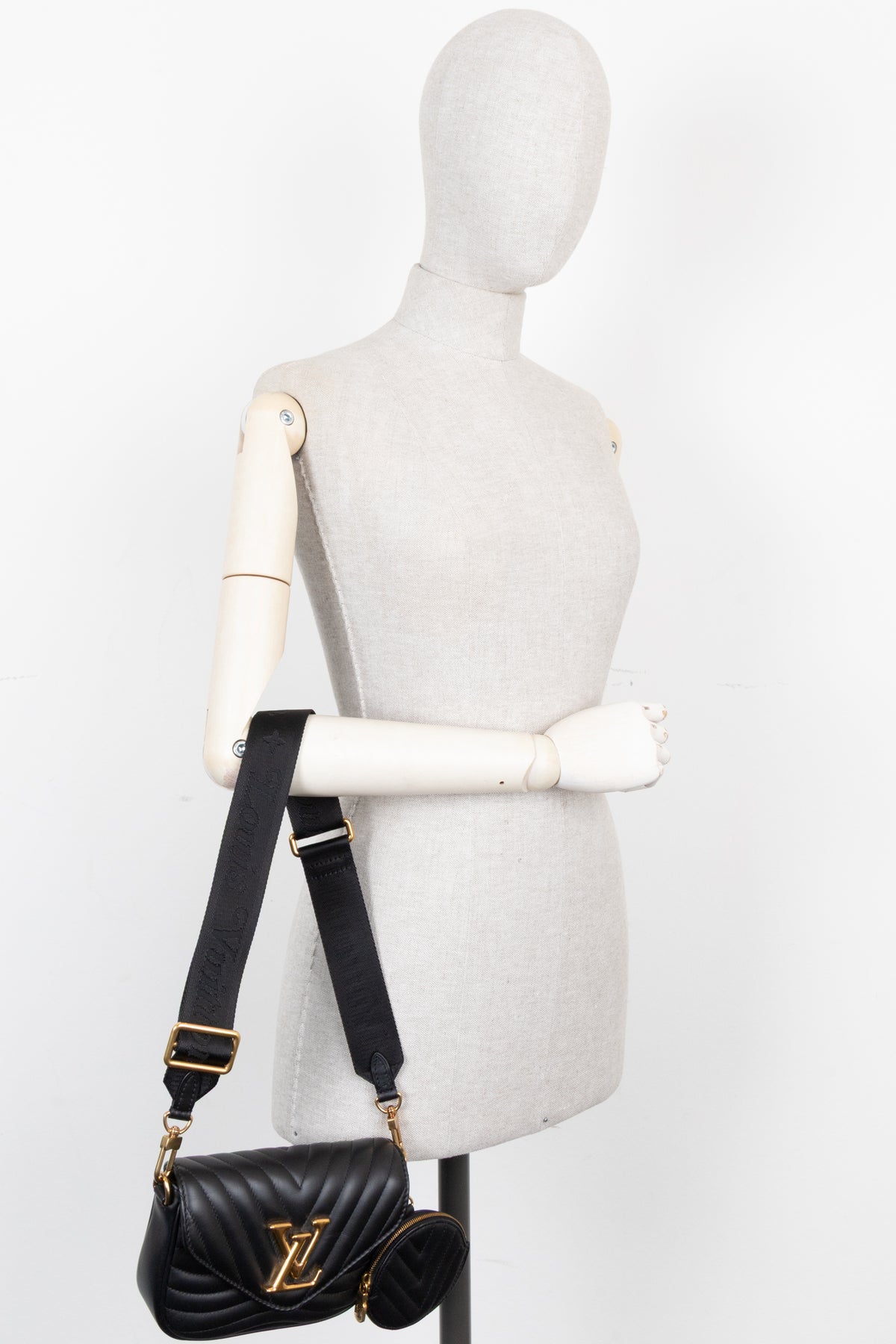 Die schwarze Louis Vuitton New Wave Multi Pochette ist ein vielseitiges und modernes Accessoire. Sie ist aus gestepptem Kalbsleder gefertigt und mit dem ikonischen LV-Monogramm auf der Flap verziert.