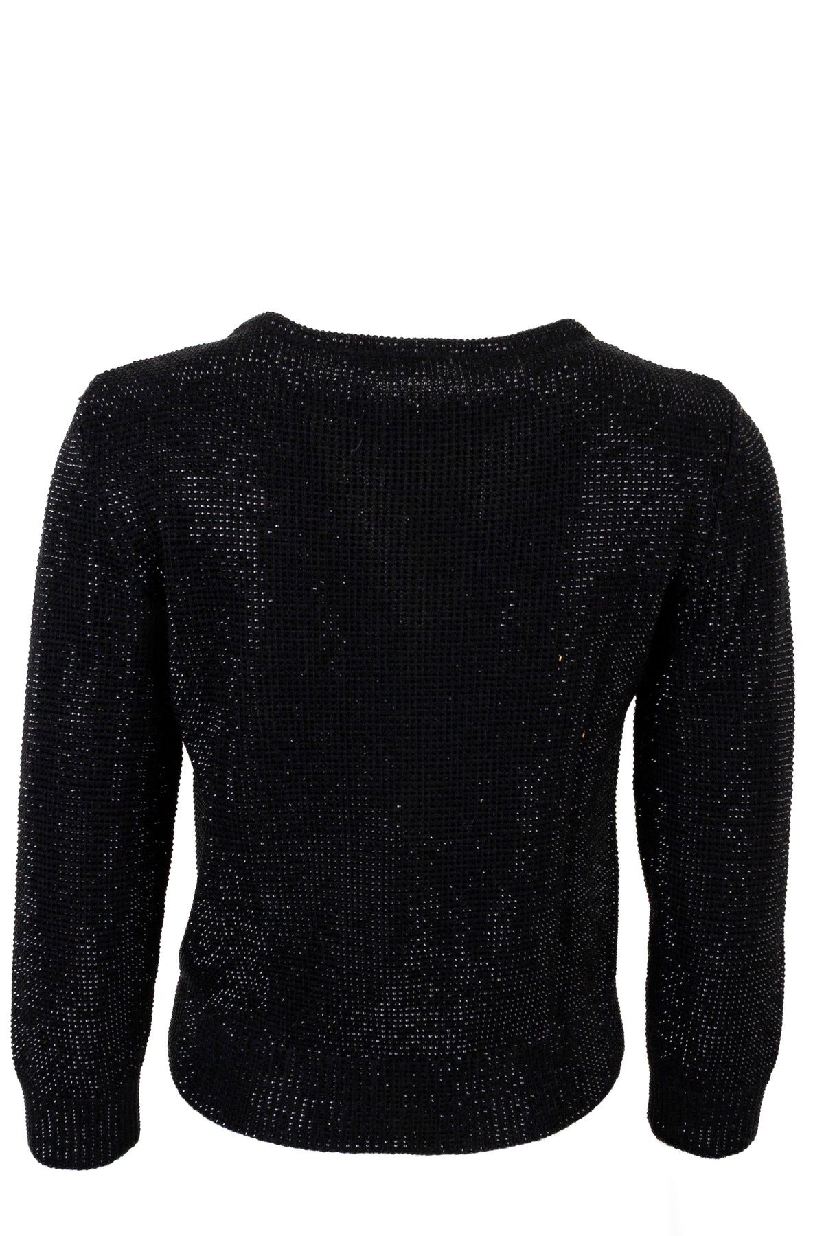 Ein Stück, das durch seine aufwendige Verarbeitung auffällt, dieser Knit von Celine ist über und über mit schwarzen und klaren Strasssteinen besetzt, die der weichen Alpaca-Wolle Tiefe und Lichtspiel verleihen. Das grafische Muster der Steine erinnert an eine Stickerei aus Kristallen, während der sanfte Farbverlauf in Schwarz und Ecru dem Gesamtbild eine ruhige Balance gibt.