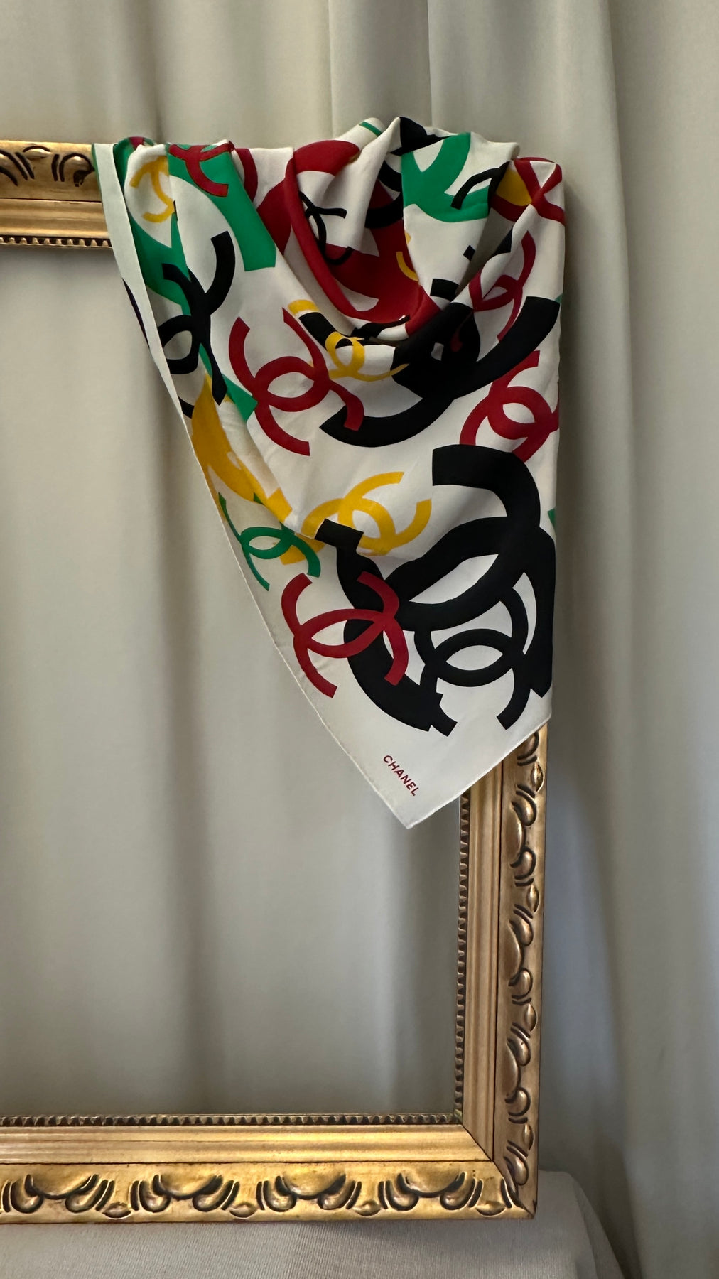 Quadratisches Seidentuch mit einem mehrfarbigen CC‑Motiv. Das Design verbindet die ineinander verschlungenen CC‑Logos mit einer Regenbogenpalette aus Blau, Grün, Orange, Pink, Rot, Weiss und Gelb gefertigt aus weichem Seidentwill. Handgerollte Kanten vollenden das 90‑cm‑Carré, das sich um den Hals oder an einer Tasche tragen lässt und jedem Outfit einen farbenfrohen Akzent verleiht.