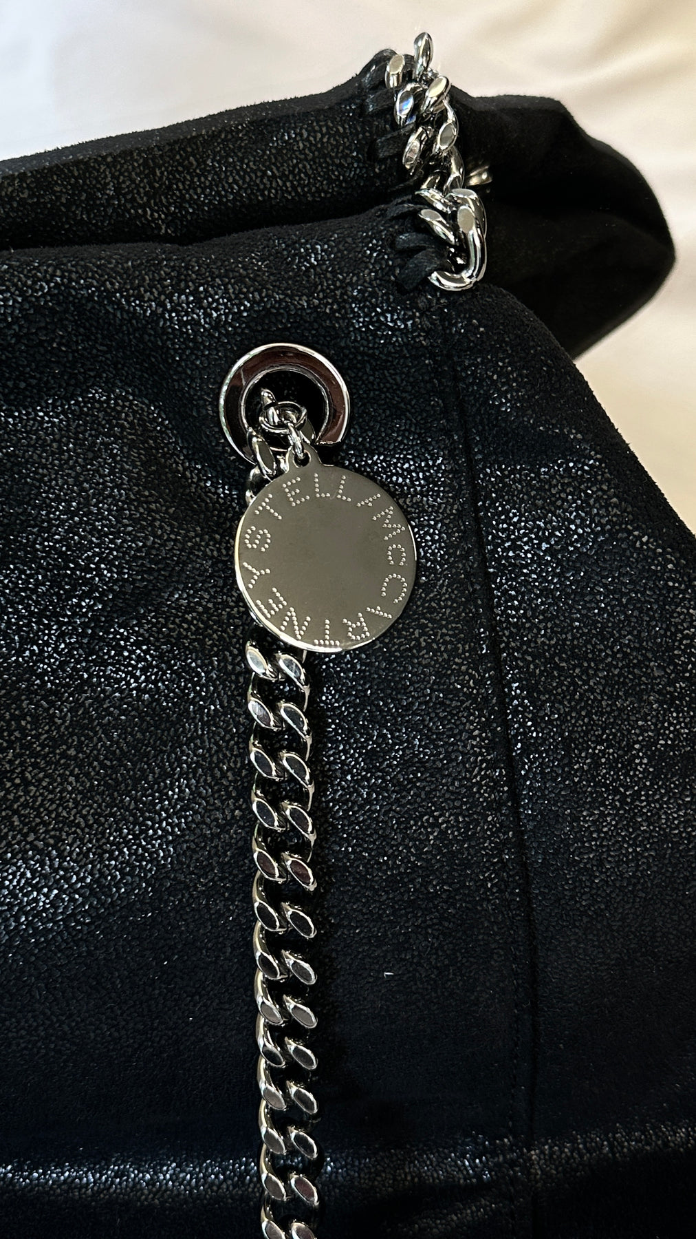 Der Falabella Rucksack in Schwarz ist eine stilvolle und praktische Alternative zur klassischen Tote Bag. Gefertigt aus weichem, genarbtem Kunstleder, zeigt er die markentypische diamantgeschliffene Kettenverzierung und einen Kordelzugverschluss unter der Frontklappe.
