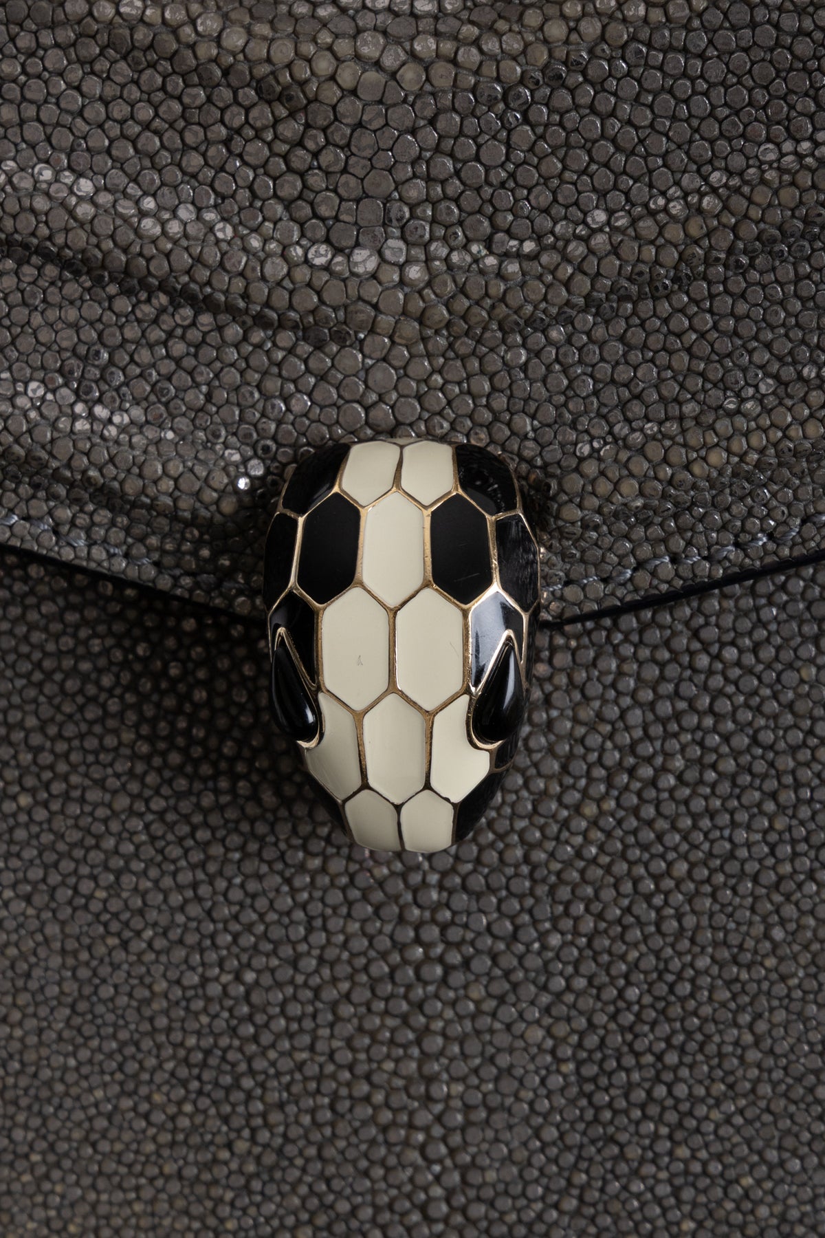 Material: Karungleder, Kalbsleder, Messing, Emaille, Onyx