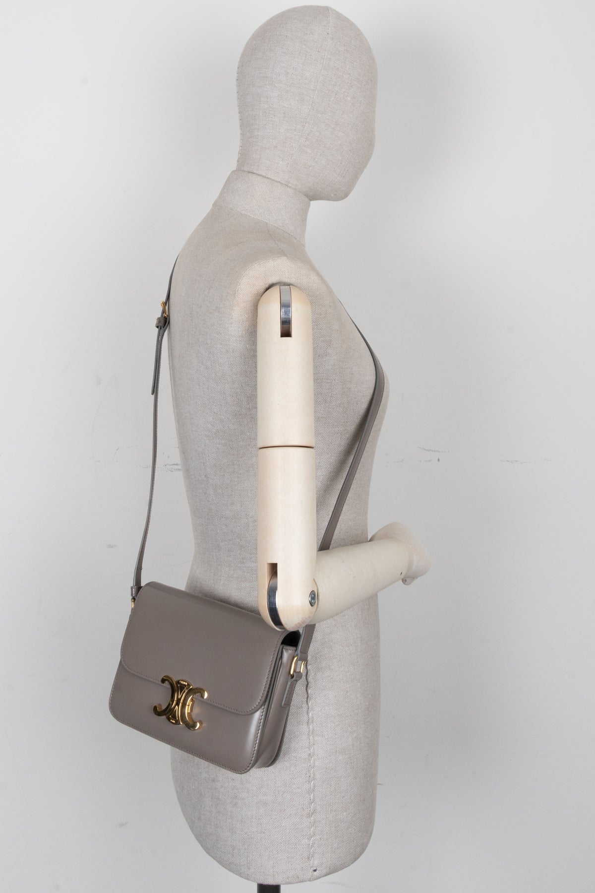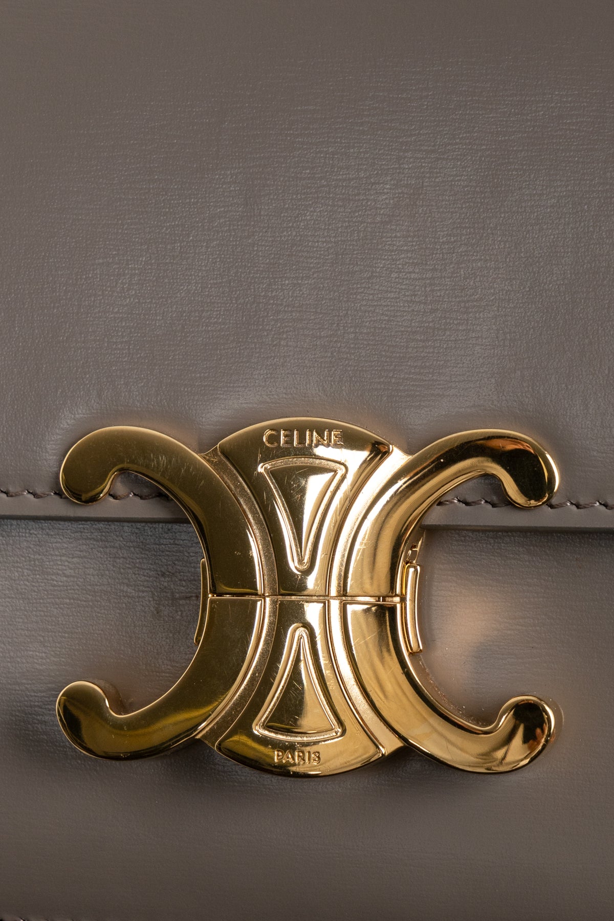 Die CELINE Teen Triomphe in grauem, glänzendem Kalbsleder verbindet eine klare, reduzierte Form mit den historischen Codes der Maison. Das Triomphe-Emblem auf der Vorderseite geht auf ein Motiv aus den 1970er-Jahren zurück: Inspiriert von den ineinander verschlungenen Kettengliedern rund um den Pariser Arc de Triomphe wurde es zu einem der prägnantesten Symbole von CELINE und später von Hedi Slimane neu interpretiert.