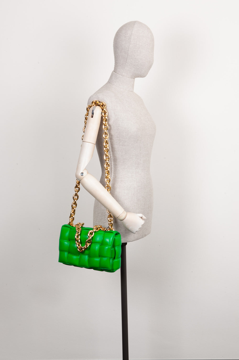 We Love: A larger interpretation of the classic intrecchiato, the Chain Cassette Bag creates a true statement piece. Featuring an equally striking shoulder chain, the iconic Parakeet Green is perfect for spring!