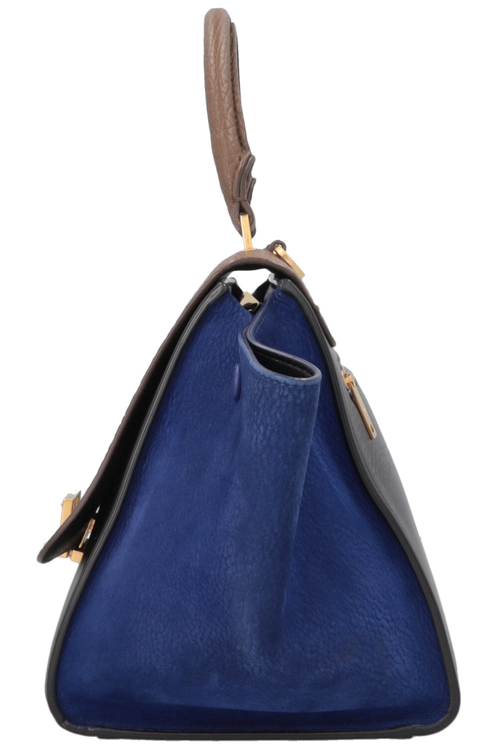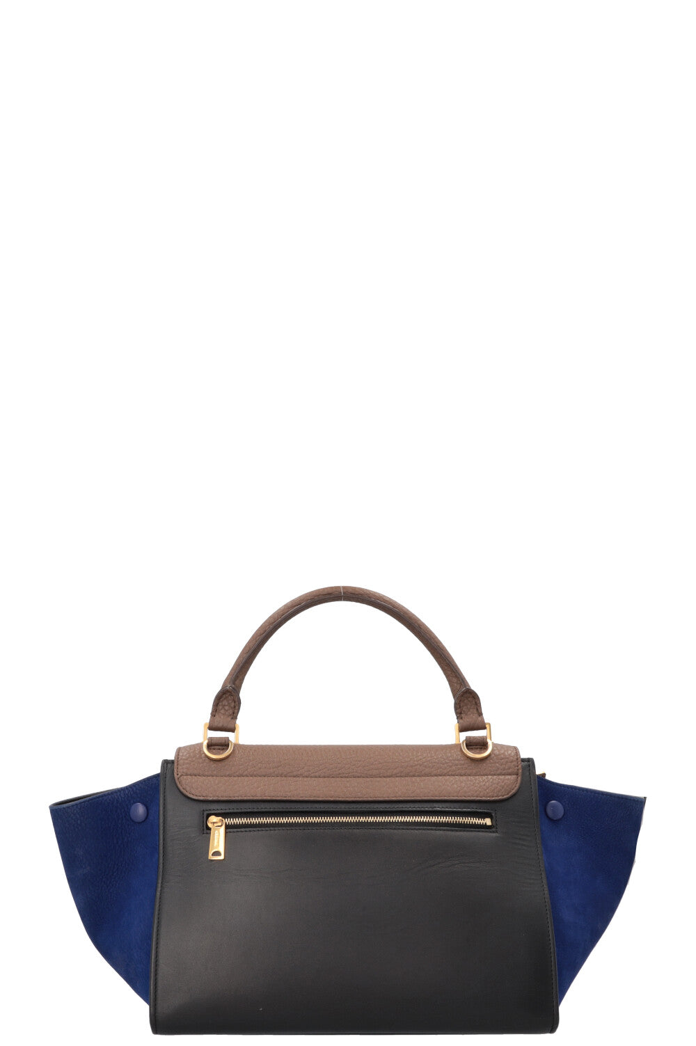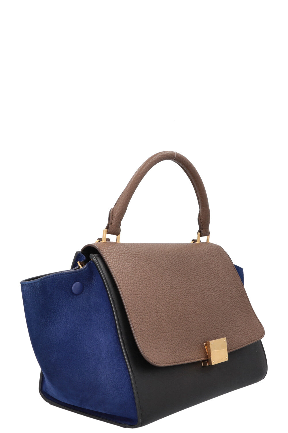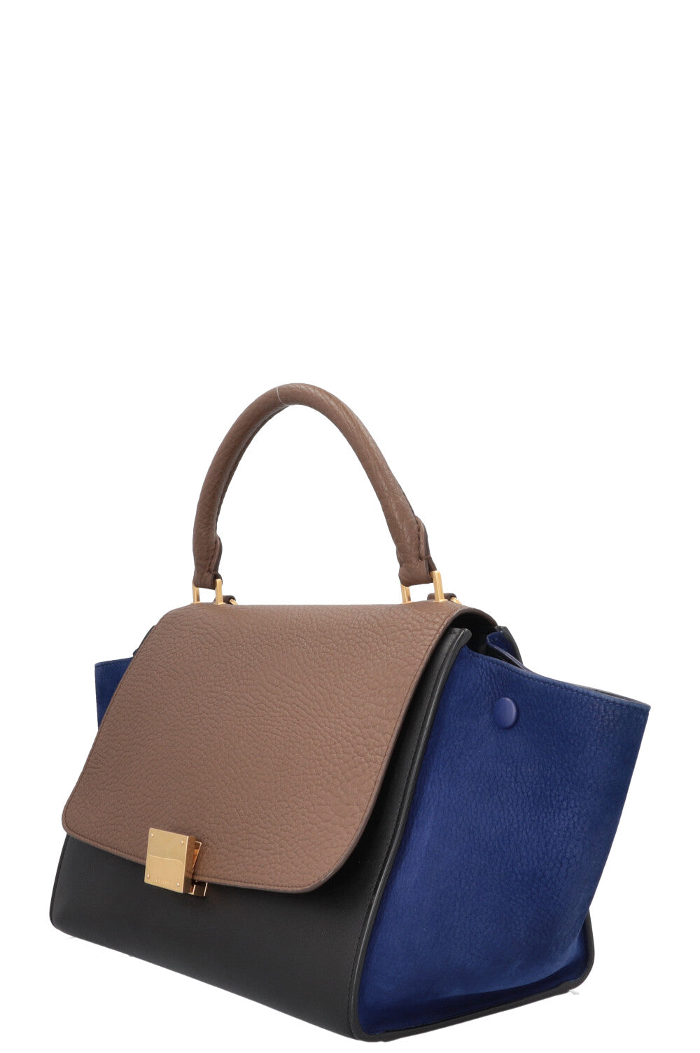 The CÉLINE Small Trapeze Hand Bag Tricolor is a treasure from the Phoebe Philo era, designed as a clean, everyday handbag with a graphic silhouette. Its name refers to its shape: a trapezoidal body with striking side wings that can be elegantly folded in or flared out, depending on the occasion. The combination of the top handle, flap, and closure unites structure and flexibility, intended for a wardrobe that is understated yet makes a statement.