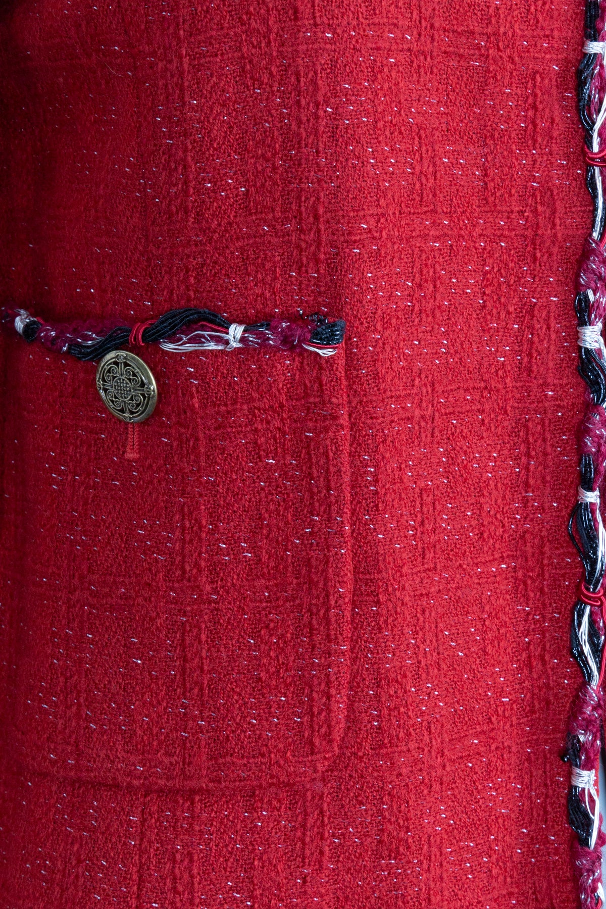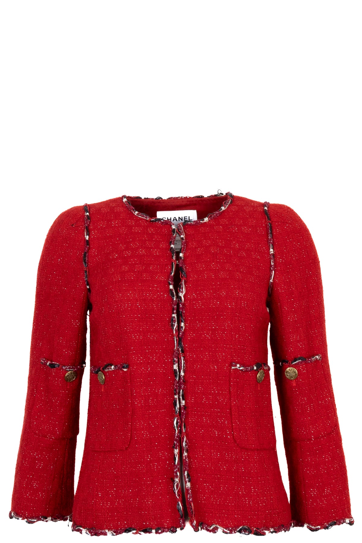 This classic red Chanel tweed jacket from the 2010 collection is a prime example of the unmistakable craftsmanship of the House of Chanel. The vibrant red gives the iconic silhouette an expressive, feminine character, while details such as the gold buttons with a small logo perfectly embody Parisian chic.