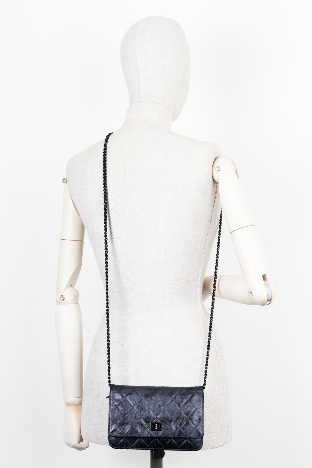 The CHANEL 2.55 Wallet on Chain in Metallic Navy is a treasure that combines classic design with practicality. Crafted from finely grained calfskin in a deep, metallic navy shade, the model incorporates the iconic elements of the 2.55 line—including the signature Mademoiselle clasp and even quilting inspired by equestrian clothing.