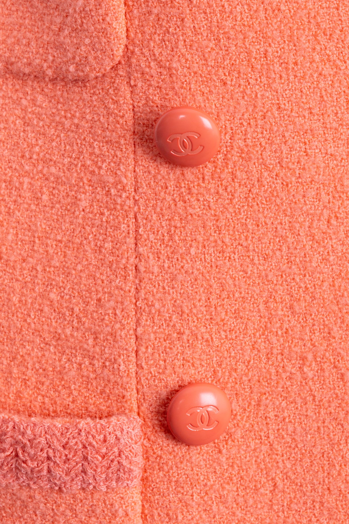 The CHANEL Double Breasted Bouclé Blazer Jacket in Salmon embodies the signature combination of structure, material, and clean lines for which the House is renowned. The finely woven bouclé gives the jacket a vibrant texture and incorporates one of the key materials in Chanel's history, a staple of the collections since the 1950s.