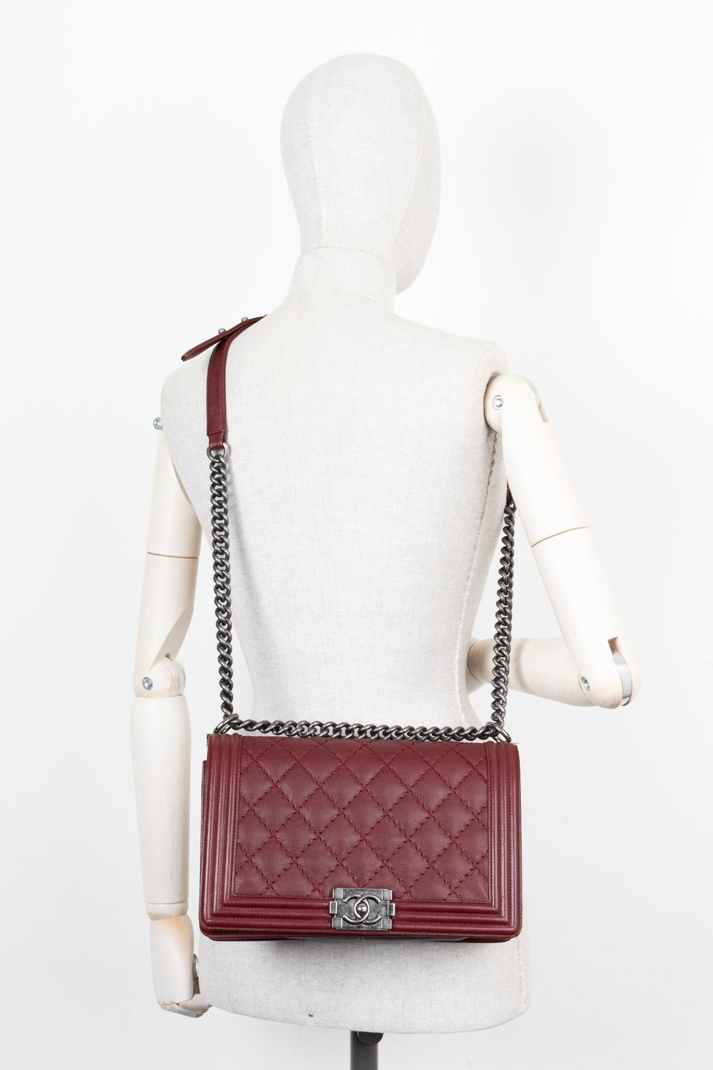 The Large Boy Bag is an iconic reinterpretation of the legendary Chanel bags, inspired by the modern aesthetic of the 21st century. The luxurious Bordeaux leather exudes depth and elegance, giving the bag a powerful presence. With its signature quilted pattern and striking chain, it combines classic Chanel tradition with urban, confident style. A timeless companion for strong personalities.