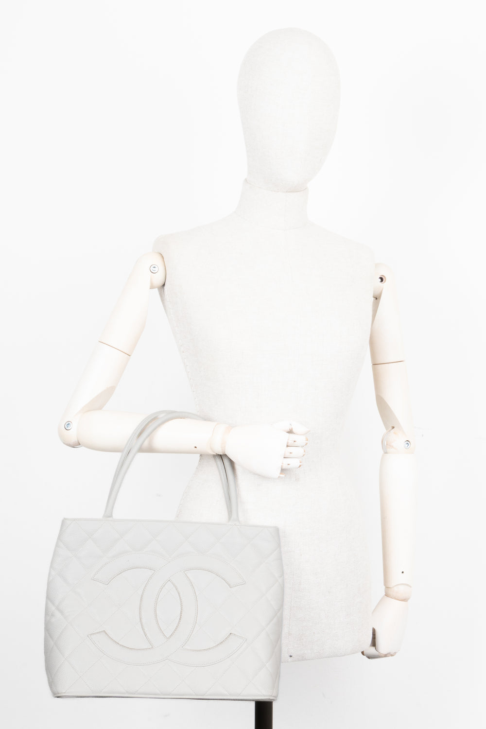 The CHANEL Medallion Tote Bag in white leather is a classic treasure from the Maison's archives, captivating with its clean shape, practical size, and iconic design elements. The bag takes its name from the round zipper medallion, embossed with the CHANEL logo and serving as a striking detail on the top edge. Crafted from textured Caviar leather, a textured, durable calfskin with a lightly grained surface, the bag is particularly resistant to scratches and everyday wear. The white color, combined with the Caviar finish, creates a fresh yet solid and understated look, lending the bag versatility in styling.