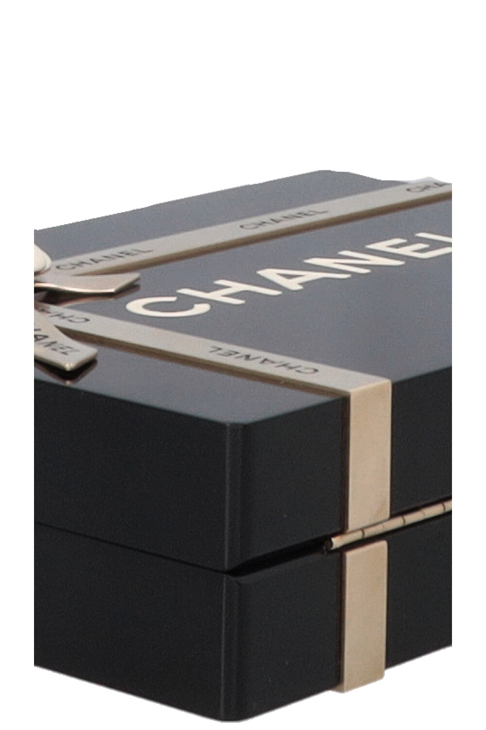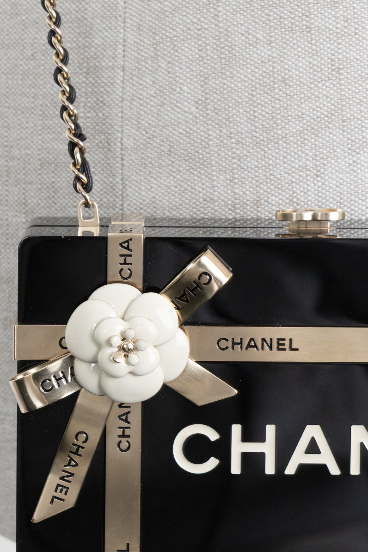 The CHANEL Gift Box Minaudière in black is a strictly limited-edition evening bag from the House of CHANEL, crafted from high-gloss plexiglass with gold-tone hardware and a fine leather lining. Its name and design are inspired by the iconic CHANEL gift box: rectangular, compact, and with clean lines.