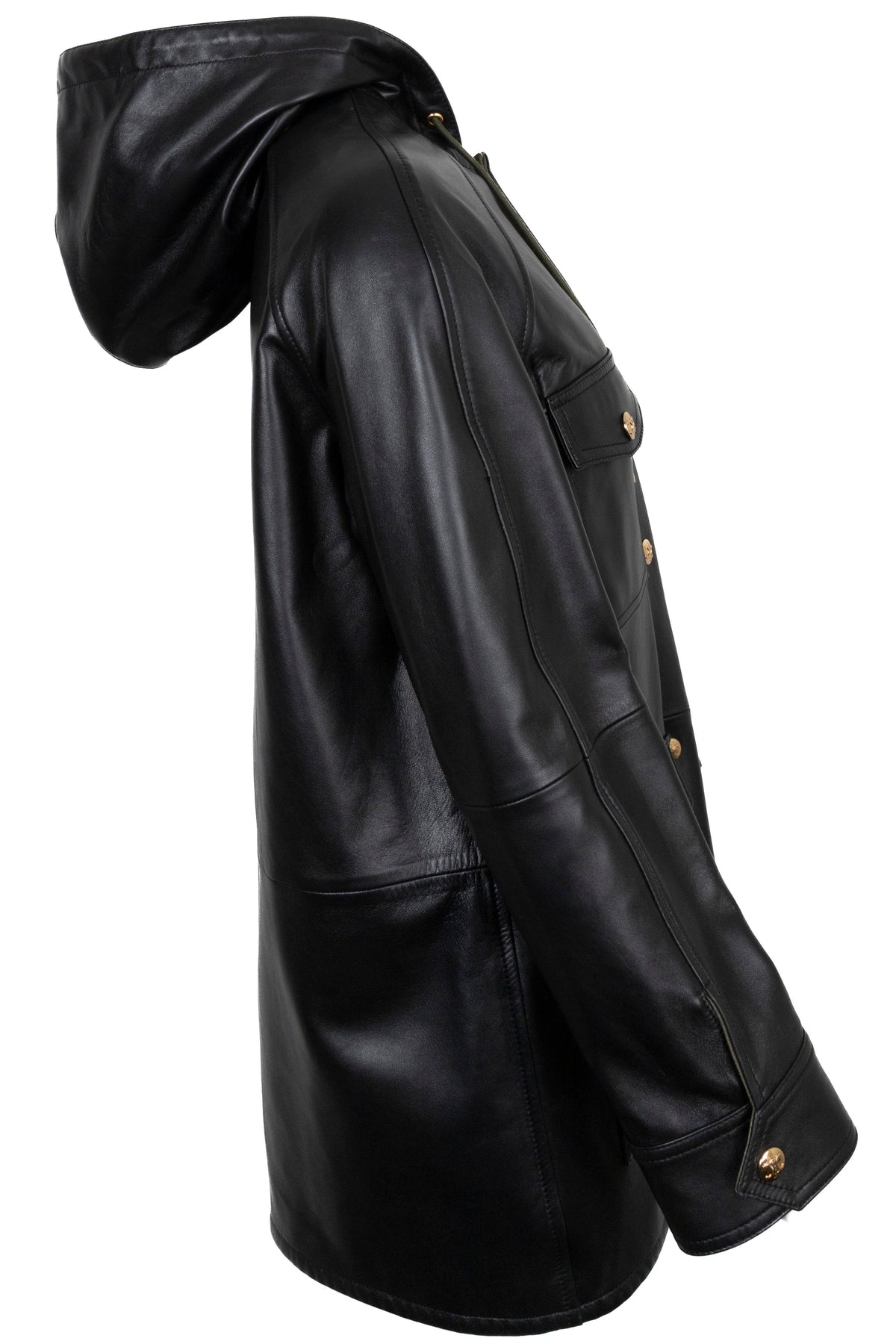 The CELINE Parka Jacket, crafted from soft lambskin leather, combines a calm, urban silhouette with high-quality workmanship. The exterior is a deep black, structured and cleanly tailored. Inside, a contrasting dark green lining adds a subtle accent, lending the garment additional depth.