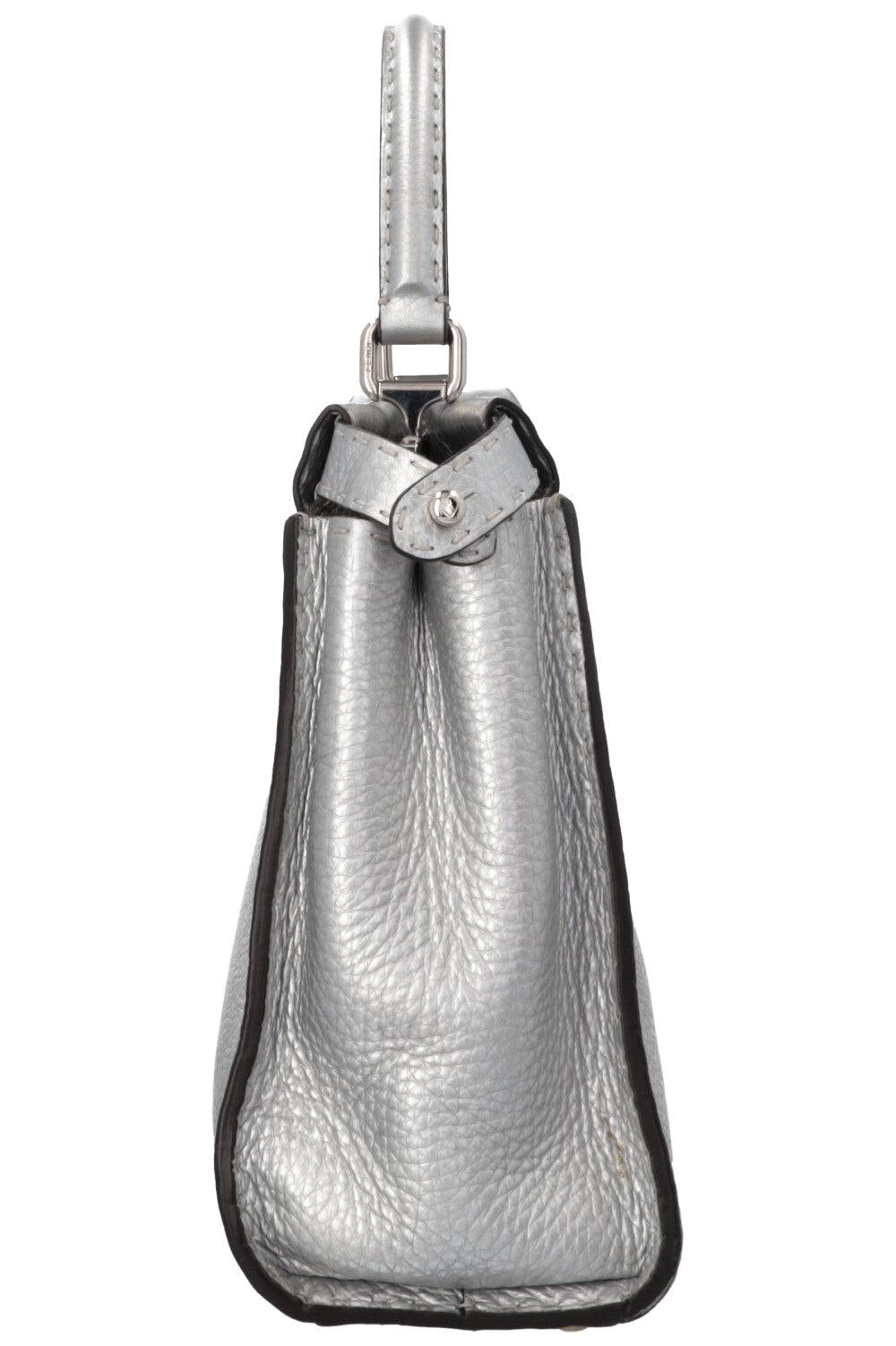The FENDI Peekaboo Medium in silver leather is part of the iconic Peekaboo line, designed by Silvia Venturini Fendi in 2009. The bag combines classic elegance with modern functionality and is characterized by its flexible center panel, which subtly reveals the interior – hence the name "Peekaboo." The silver leather makes the bag a particularly striking statement piece: its metallic shimmer reflects light and lends a modern, futuristic touch to any outfit.