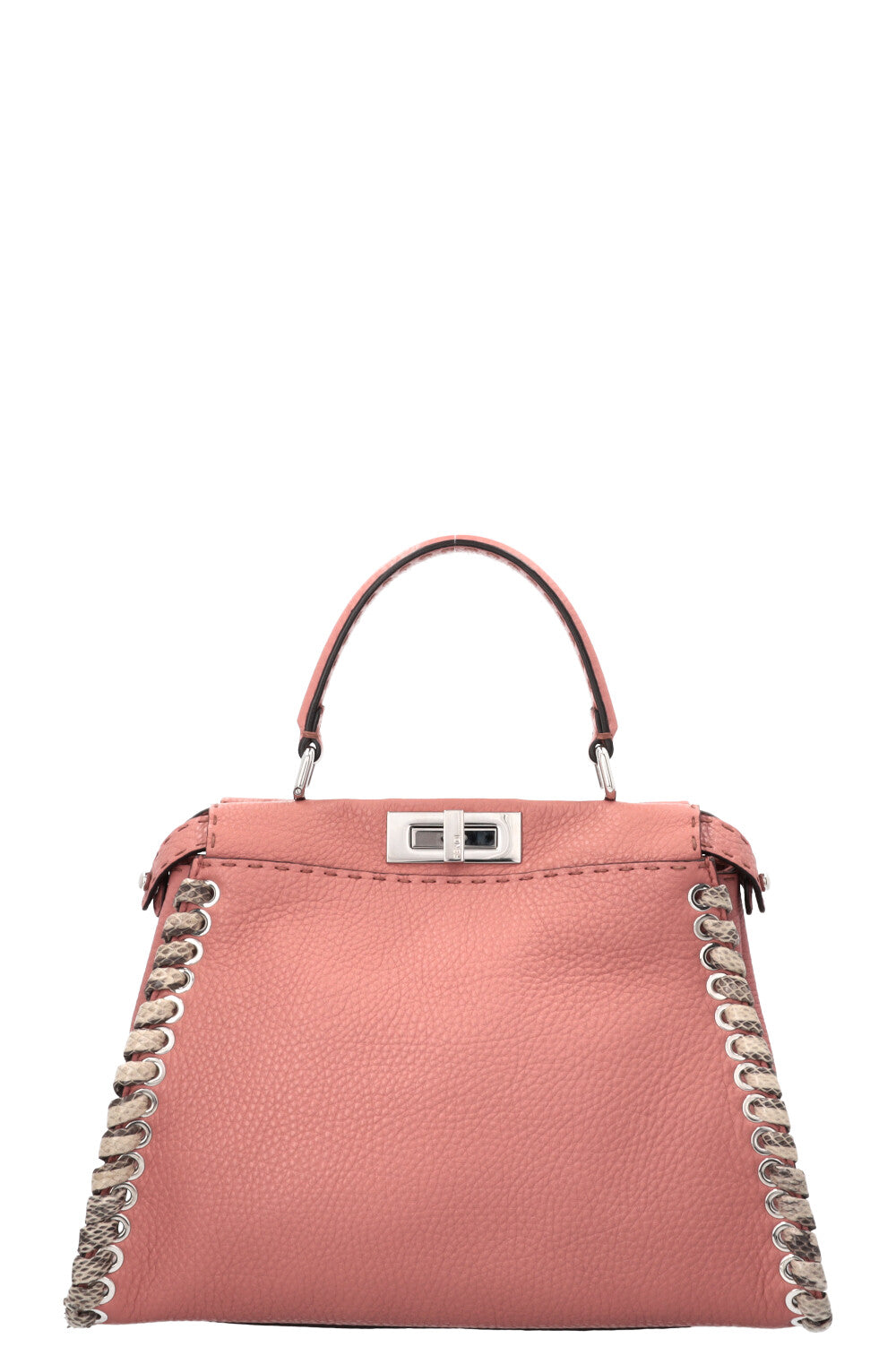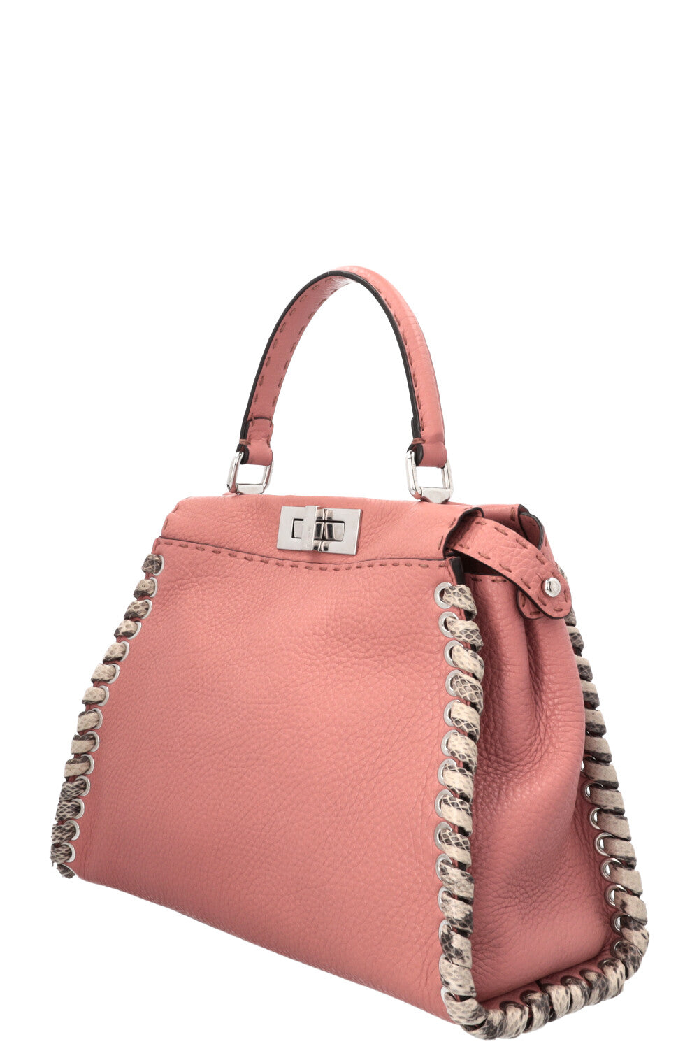 The FENDI Peekaboo Medium in Pink belongs to the iconic Peekaboo line, designed by Silvia Venturini Fendi in 2009. Combining classic elegance with modern functionality, the bag is characterized by its flexible center panel, which subtly reveals the interior – hence the name "Peekaboo." The delicate pink hue lends the bag a fresh, feminine character and adds a playful touch to everyday life. The medium size offers ample space for personal essentials without compromising its clean, compact silhouette. The structured form reflects FENDI's philosophy: timeless design, meticulous craftsmanship, and contemporary details.