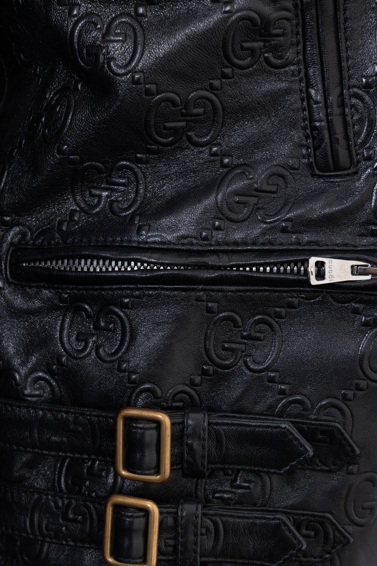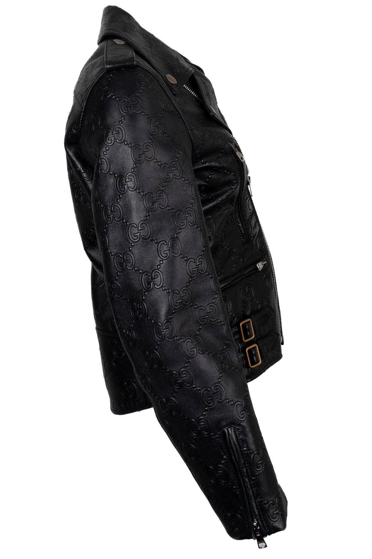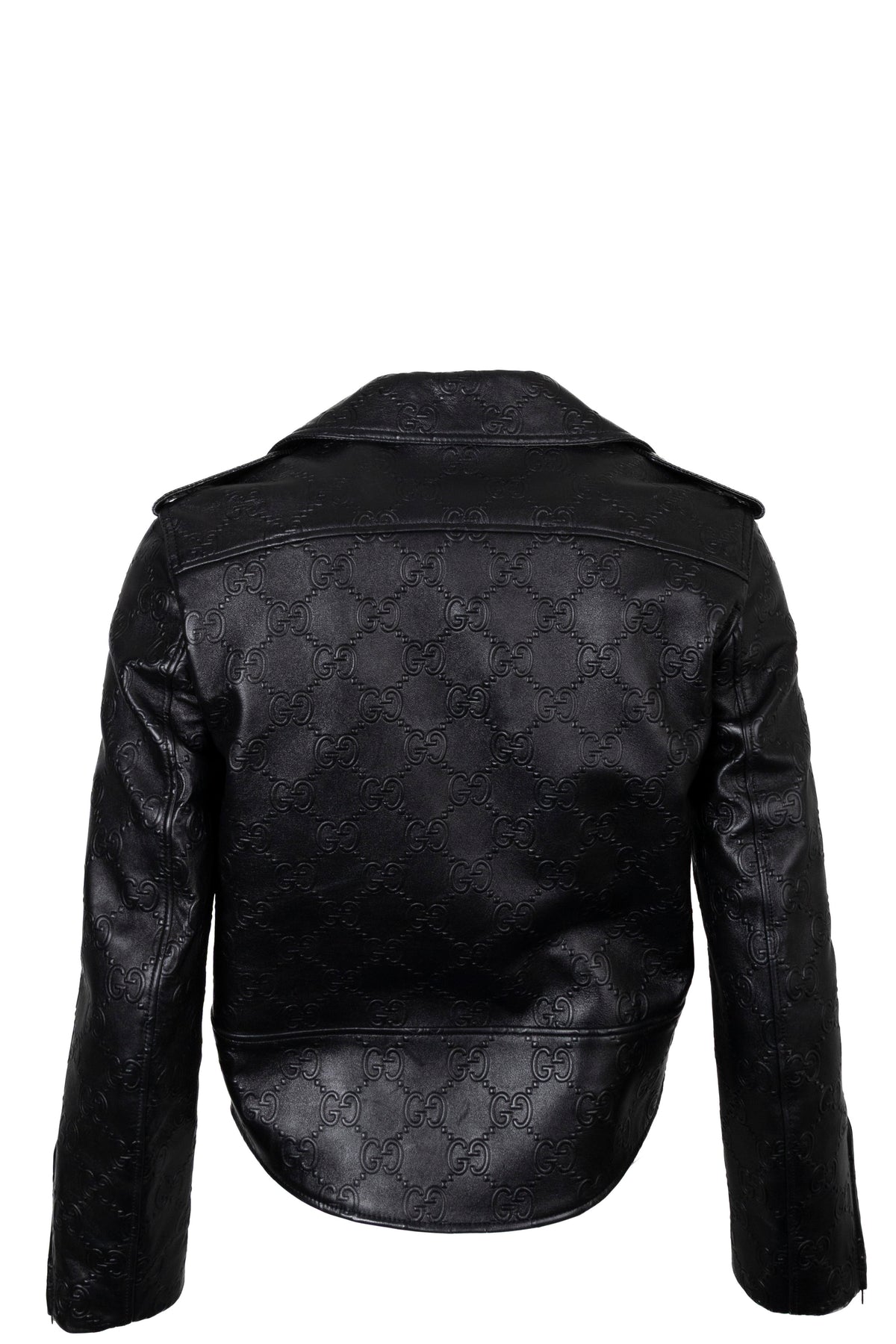 This Gucci jacket combines the look of a classic biker jacket with the house's unmistakable style. Crafted from black embossed leather, it features an all-over GG motif that adds structure and distinctive character to the design. The asymmetrical front zipper, snap buttons on the lapel, and long zippers on the sleeves all incorporate typical biker elements.