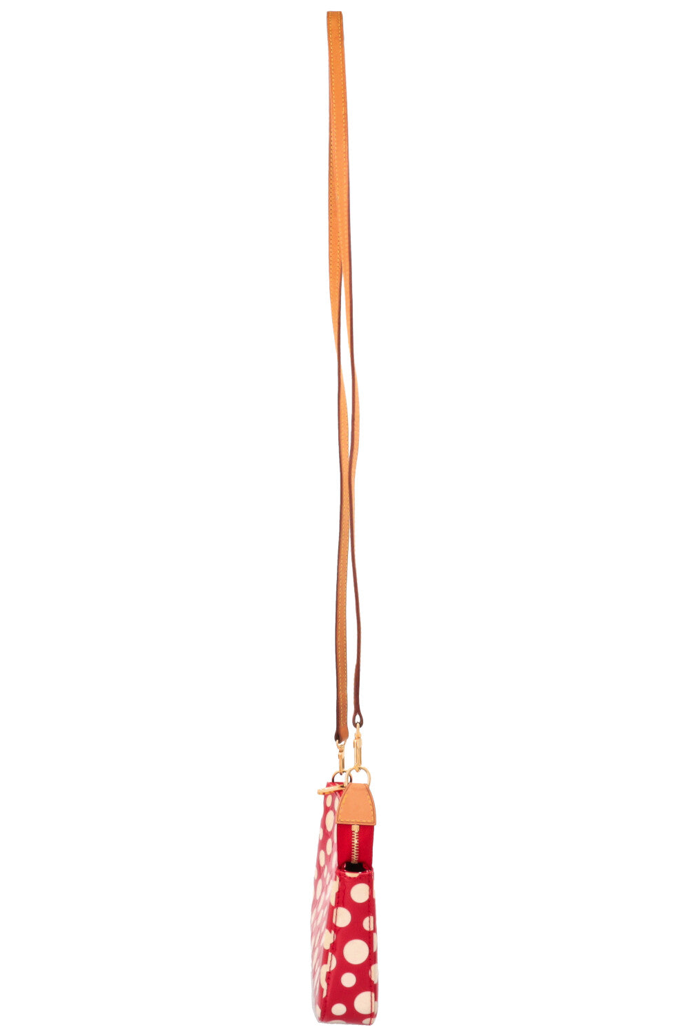 This pochette, crafted from glossy Vernis leather, features the red dot motif that is one of Kusama's most recognizable signatures. Gold-tone hardware and its compact form make it a special piece in this art and fashion collection.