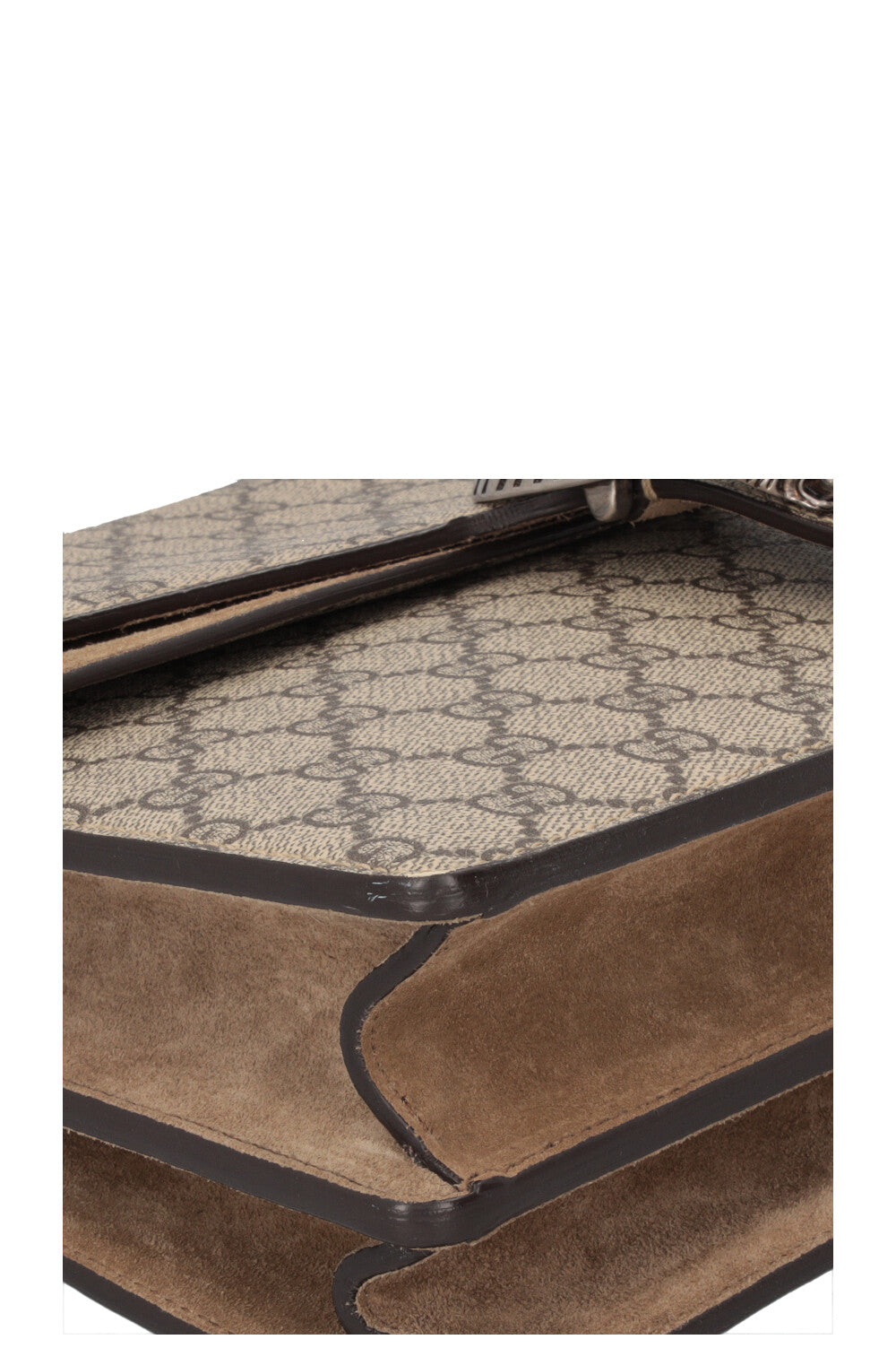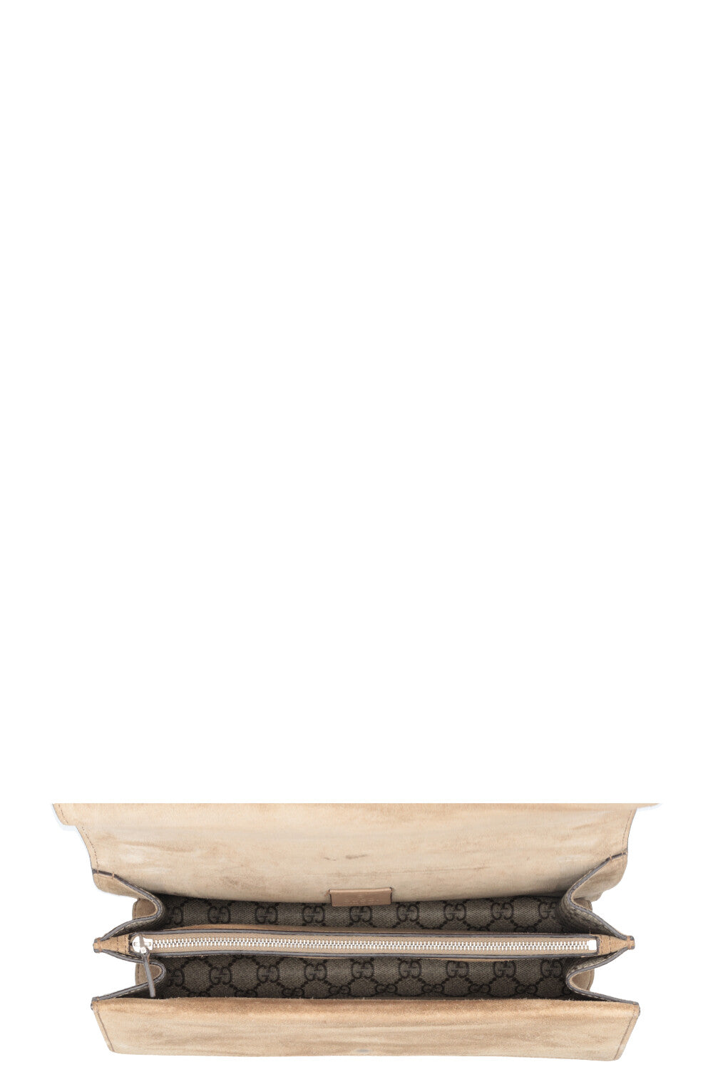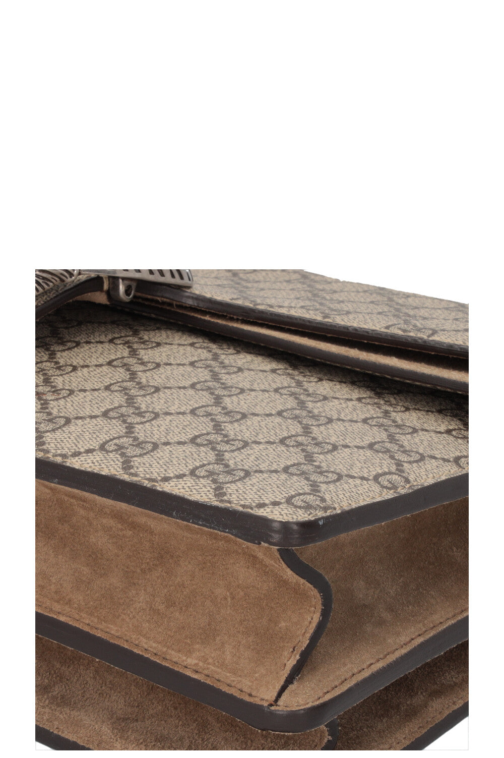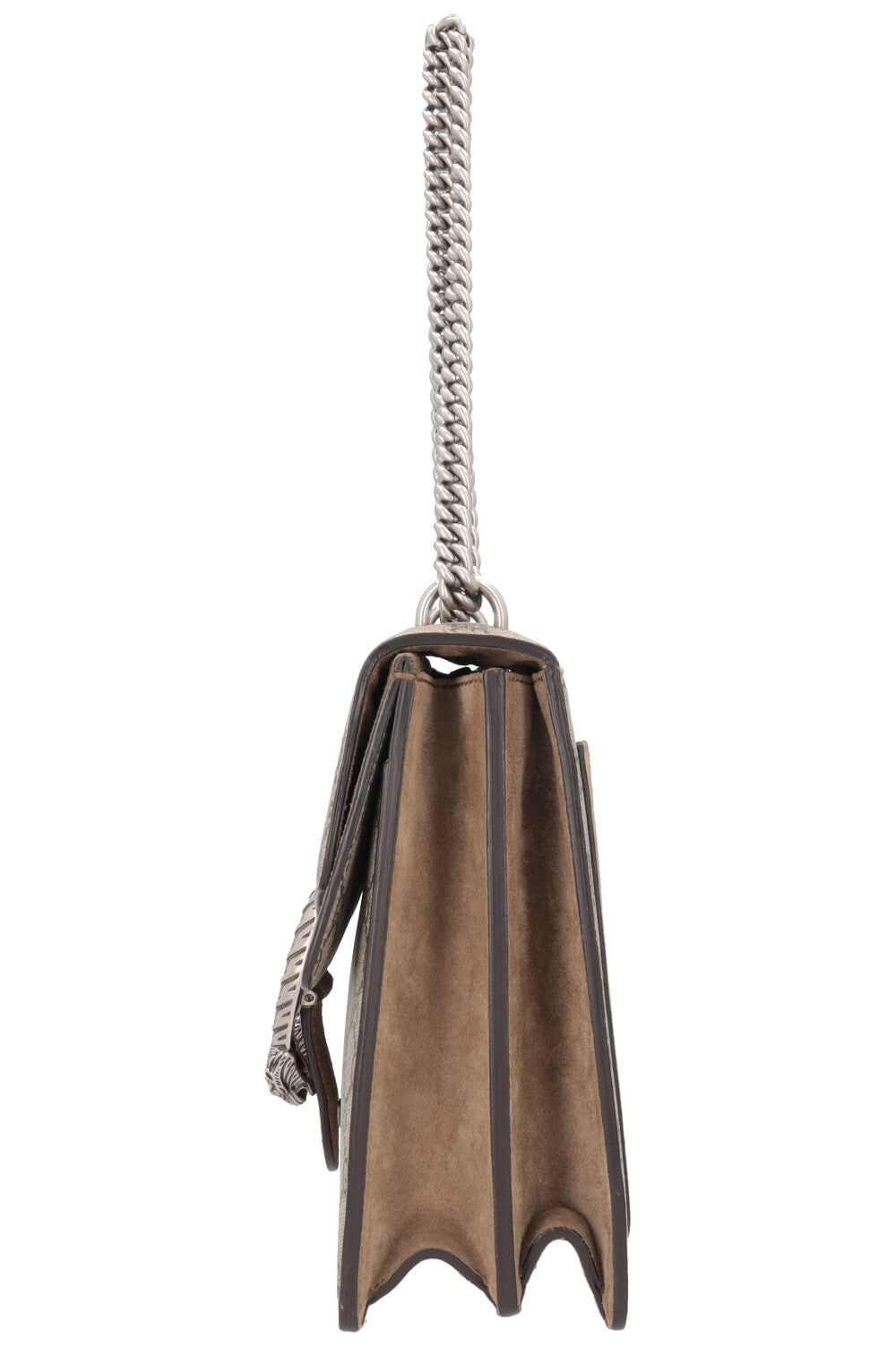 The Dionysus Bag is one of Alessandro Michele's most striking designs and was named after the Greek god. The signature tiger head closure references the legend in which Dionysus sent a tiger to carry a nymph across the river. This medium-sized Treasure features a structured shape with a clear flap and a chain strap that can be worn doubled or long. The GG Supreme canvas gives the Treasure a graphic appearance and is both durable and lightweight. It is usually complemented by suede details that add depth to the design. The color ranges from warm beige tones, complemented by antique-looking silver-colored hardware. The interior of the bag is functionally divided and softly lined. A Treasure that combines symbolism, clear proportions, and everyday practicality without being overly formal.