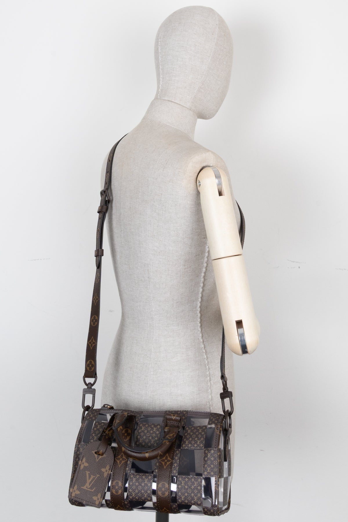 This Monogram Chess version of the Keepall 25 for Autumn/Winter 2022 showcases designer Virgil Abloh's latest creative interpretation of a classic Louis Vuitton signature pattern. The historic Damier pattern is reimagined through alternating squares of Monogram canvas and crystal-clear PVC.