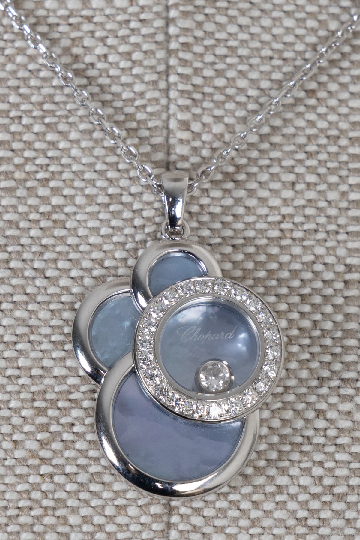 Chopard's Happy Diamonds Happy Dreams Necklace is crafted from 18-karat white gold and features the signature design of the Happy Diamonds collection. The centerpiece is the freely moving diamonds, set between two sapphire crystals, which shift subtly with every movement. The pendant is adorned with mother-of-pearl alongside the sparkling diamonds.