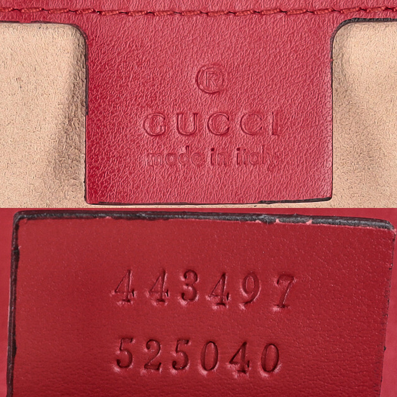 The Gucci Authenticity Tag is available on selected items and provides details on the identity and care of the product as well as personalized customer service. The tag is attached to a black fabric tag inside the bag.