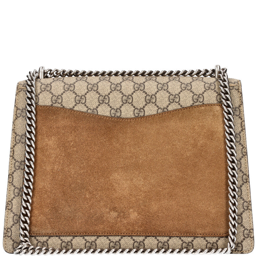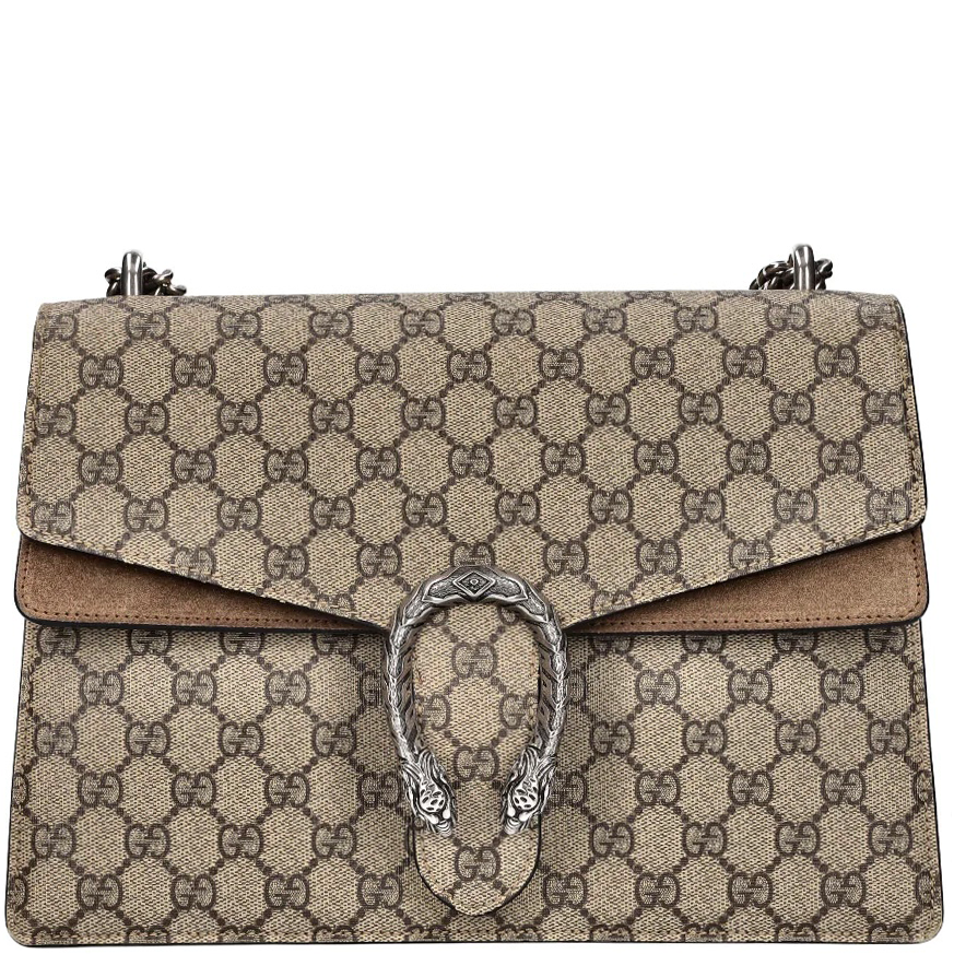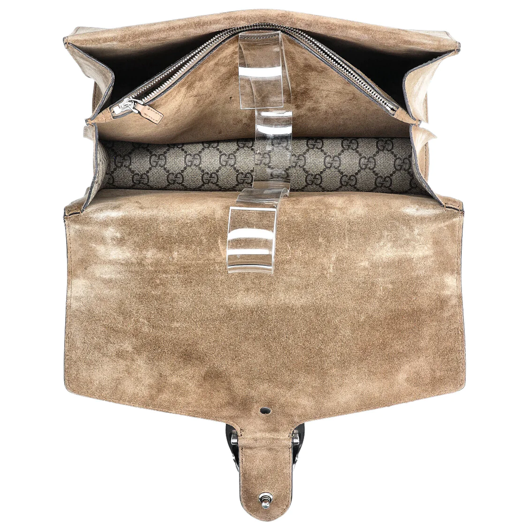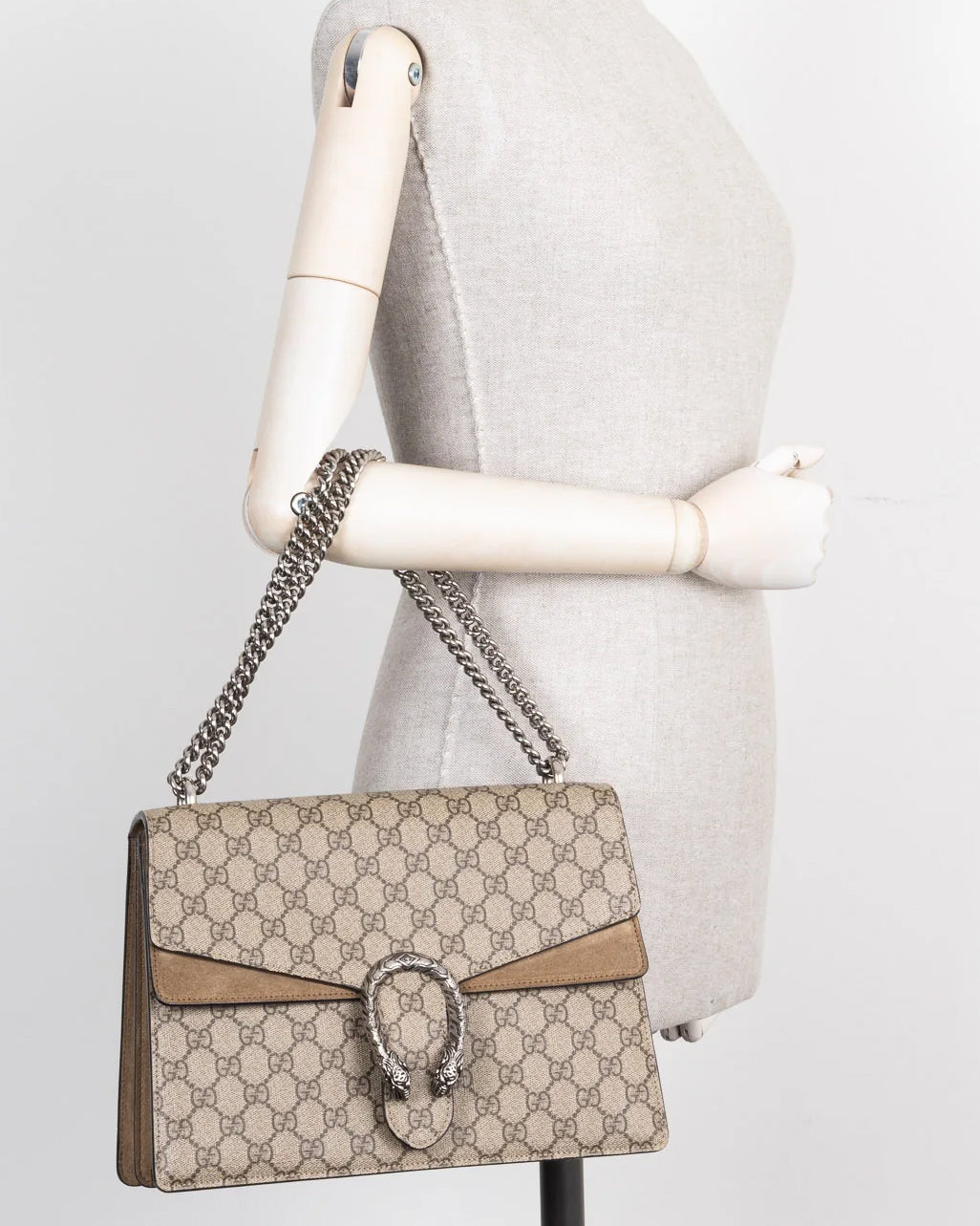 Following his rise from head of accessories to creative director in 2015, Alessandro Michele introduced the Dionysus GG Supreme Canvas Shoulder Bag. Named after the ancient Greek god Dionysus, the understated elegance of this bag has firmly established its status as a modern classic.The Dionysus bag features a double flap and convertible chain strap, which allows for versatile styling - whether worn over the shoulder or across the body. Originally available in the traditional Medium, Small, Mini and Super Mini sizes, the collection now also includes small leather goods such as coin purses and clutches. The elegant tiger clasp, inspired by the horseshoe shape, reflects the brand's long association with equestrian sports, and in terms of material choice, the Dionysus bag offers a wide range of options. The GG Supreme Canvas is available in the classic beige tone and is often combined with matching or contrasting suede on the inside flap. In addition, the bag is made from solid grained leather and suede in a variety of color options.