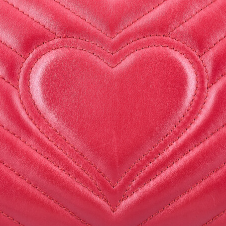 The back of the Gucci Marmont bag features a distinctive leather heart that is visible on the quilted leather. The typical design of the Gucci heart is often ignored, but counterfeit versions often have an excessively sharp point, which is a clear indication of a non-authentic Gucci product.