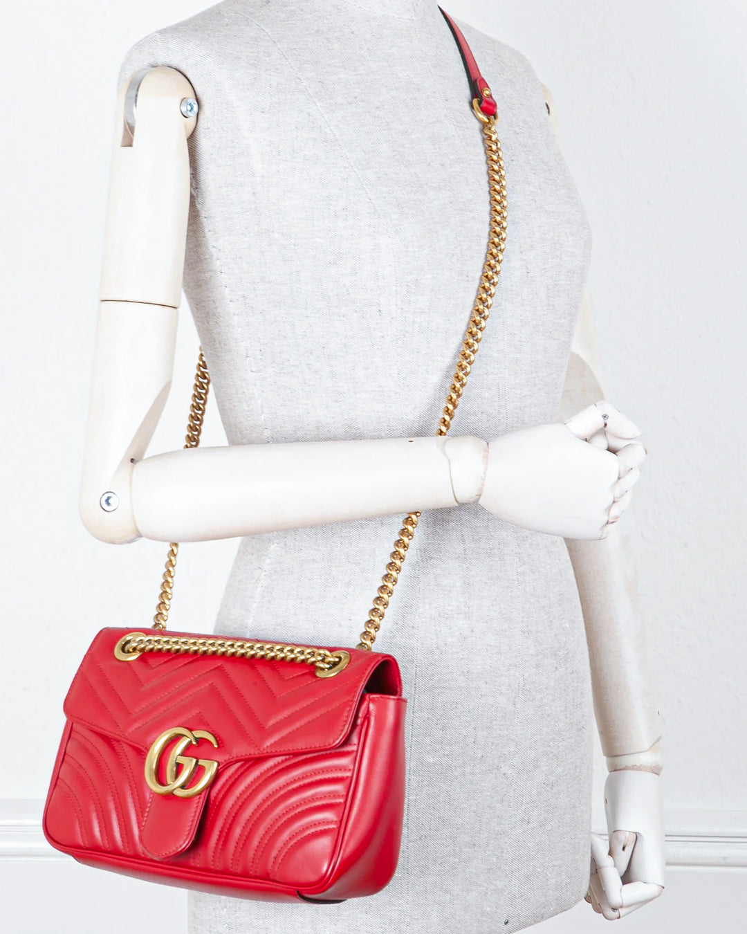 Inspired by Guccio Gucci, the founder of the brand, the GG logo first appeared in the 1970s. This emblematic design created an iconic concept that eventually led to the creation of the famous Gucci GG Marmont. However, it was not until 2016 that the GG Marmont It-Bag made its debut on the catwalk, thanks to the vision of Creative Director Alessandro Michele, who wanted to revive elements of the Gucci heritage with a new line of bags. Inspired by the spirit of the 70s and the charm of the Château Marmont, the bag became a favorite among designer bag lovers.The classic Marmont bag is made of Matelassé leather, which is known for its unpadded, elastic and quilted structure. Matelassé leather is available in either a diagonal or zigzag pattern. The Marmont collection also includes totes, backpacks and bucket bags. The adjustable and sliding chain strap offers versatile styling options, allowing the bag to be worn as a shoulder bag or as a handle bag, adding to its appeal. The Marmont bags are available in different shapes and sizes, including super mini, mini, small, medium and large, to suit a wide range of preferences.