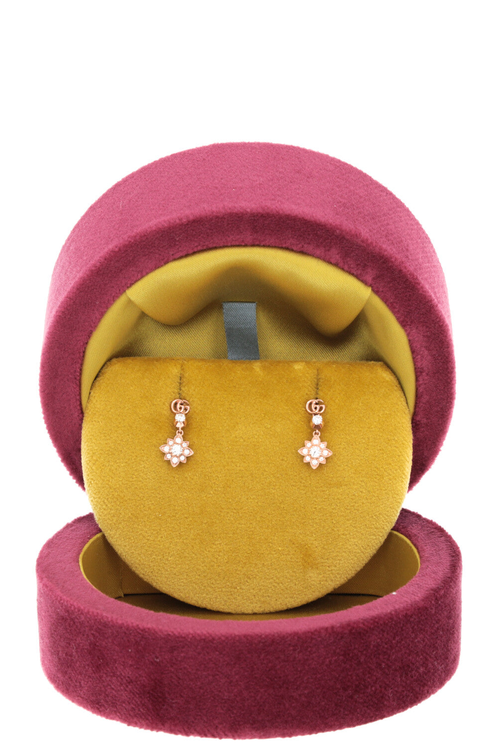 Ces boucles d'oreilles en or rose 18 carats arborent l'emblématique motif Flora, créé pour la première fois en 1966 pour la princesse Grace de Monaco. De fins diamants subliment ce délicat motif floral, lui conférant un éclat subtil et luxueux. Un clin d'œil élégant à l'héritage floral de Gucci, féminin, intemporel et symbolique.