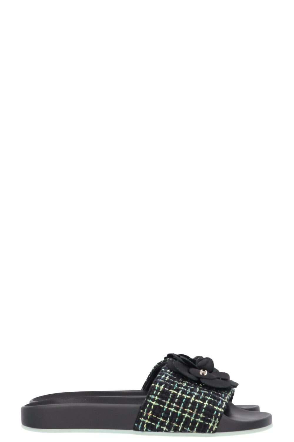 On adore : Chanel Tweed dans le style Adilette ? OH MON DIEU! Oui s'il te plaît! Chanel crée même cette rupture de style.