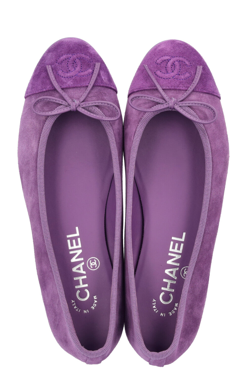 Ces ballerines Chanel arborent une couleur fraîche et féminine : un violet délicat qui vous met instantanément de bonne humeur. Le daim souple flatte le pied et assure un confort agréable, tandis que leur forme classique avec leur bout rond et leur discret logo Chanel dégagent une élégance intemporelle.