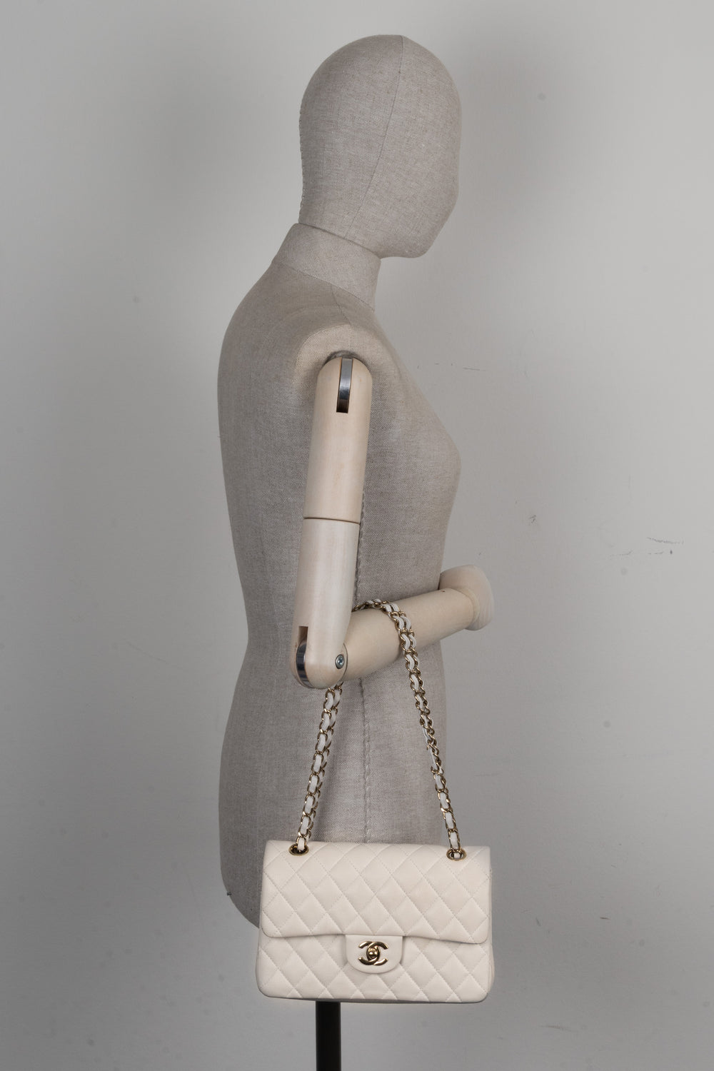Le Petit Sac à Double Rabat Chanel Blanc Caviar allie lignes classiques et élégance intemporelle, et figure parmi les modèles les plus emblématiques de la maison. La forme du rabat s'inspire du légendaire modèle 2.55 de Coco Chanel de 1955, réinterprété plus tard par Karl Lagerfeld avec son fermoir Double C et sa chaîne en cuir. Le cuir caviar se caractérise par sa texture grainée et granuleuse, plus résistante aux rayures que les cuirs lisses tout en conservant sa structure. Sa couleur blanche confère au sac une légèreté remarquable et offre une alternative élégante aux versions classiques noires ou beiges. Les finitions dorées apportent une touche subtile et chaleureuse à l'ensemble. Ce modèle à double rabat assure stabilité et structure, tandis que la chaîne peut être portée élégamment à l'épaule ou dissimulée. L'intérieur présente un agencement compartimenté bien pensé, tandis que le motif à losanges à l'extérieur souligne l'identité et le savoir-faire artisanal. Ce Trésor s'impose par sa qualité, son poids historique et sa présence harmonieuse, sans paraître exagéré.