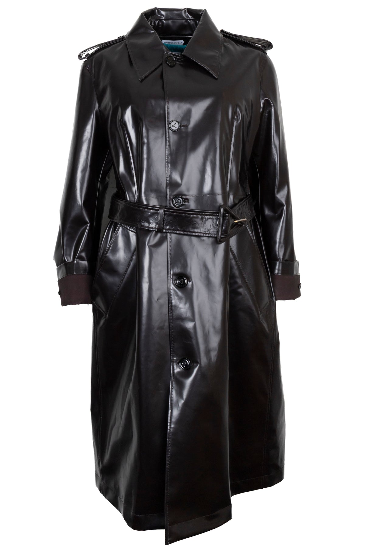 Le trench-coat ceinturé en éponge de BOTTEGA VENETA est issu de la collection Automne/Hiver 2021. Confectionné en cuir d'agneau brillant marron foncé, il arbore les détails classiques du trench-coat : ceinture à la taille, épaulettes et patte de boutonnage dissimulée. Sa doublure en éponge turquoise et sa capuche amovible en font un vêtement pratique et élégant. Le marron foncé, couleur phare de la saison, s'accorde aussi bien avec des teintes vives qu'avec des looks monochromes.