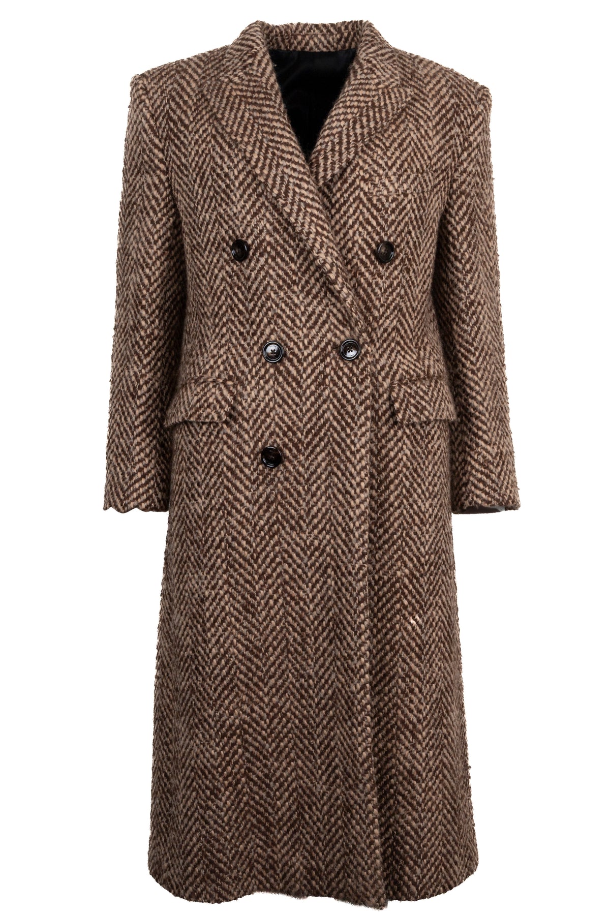 Ce manteau à chevrons Celine, d'un marron classique, incarne la silhouette d'inspiration masculine qui a permis à Hedi Slimane de redéfinir la Maison Celine. Avec sa coupe croisée, son motif à chevrons structuré et ses épaules épurées, il allie élégance parisienne et style décontracté. Sa laine de qualité supérieure lui confère poids, structure et un toucher luxueux, une pièce intemporelle pour les journées fraîches, alliant style et qualité.