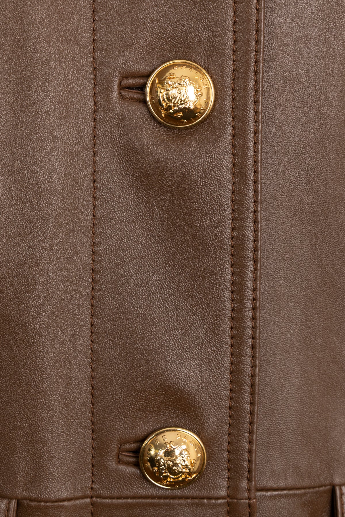 Cette veste en cuir Celine, d'un brun profond, séduit par ses lignes épurées et son cuir d'agneau souple et texturé. Les boutons ronds dorés apportent une élégante touche finale.