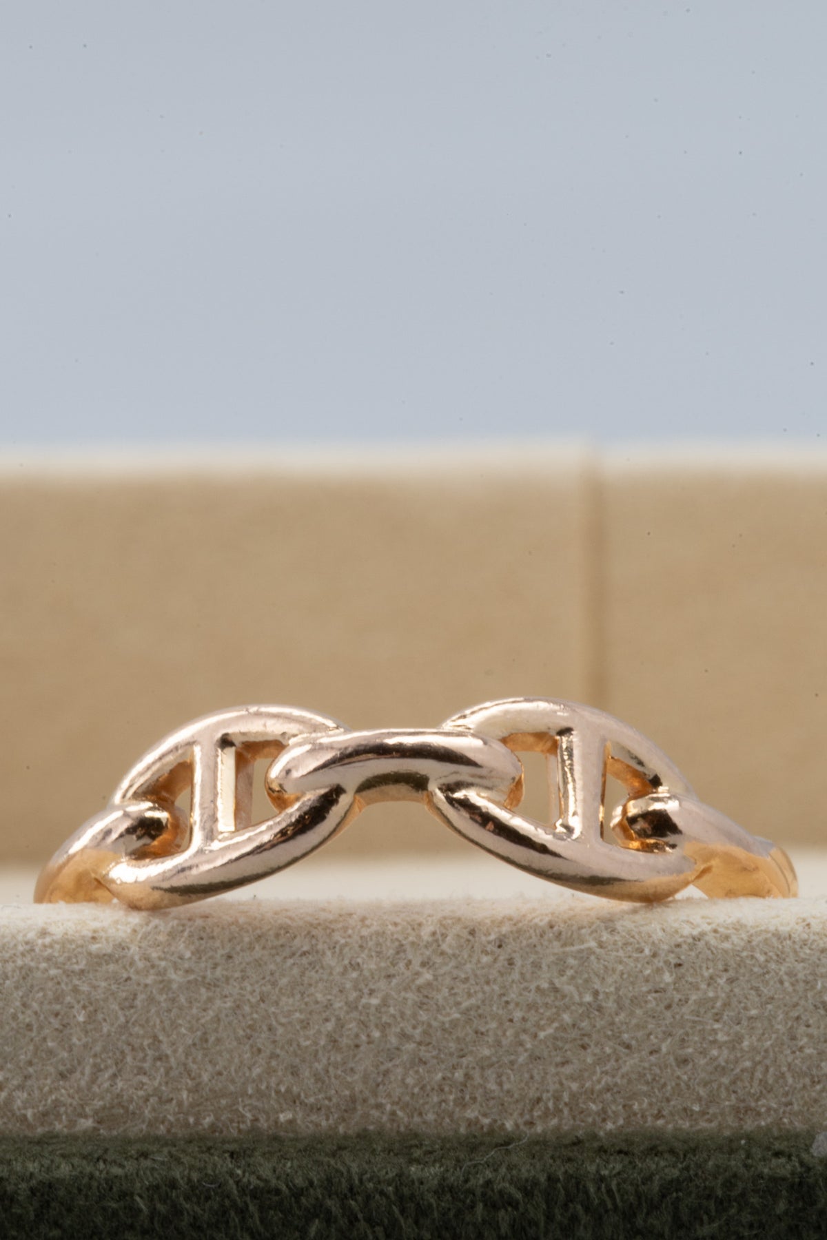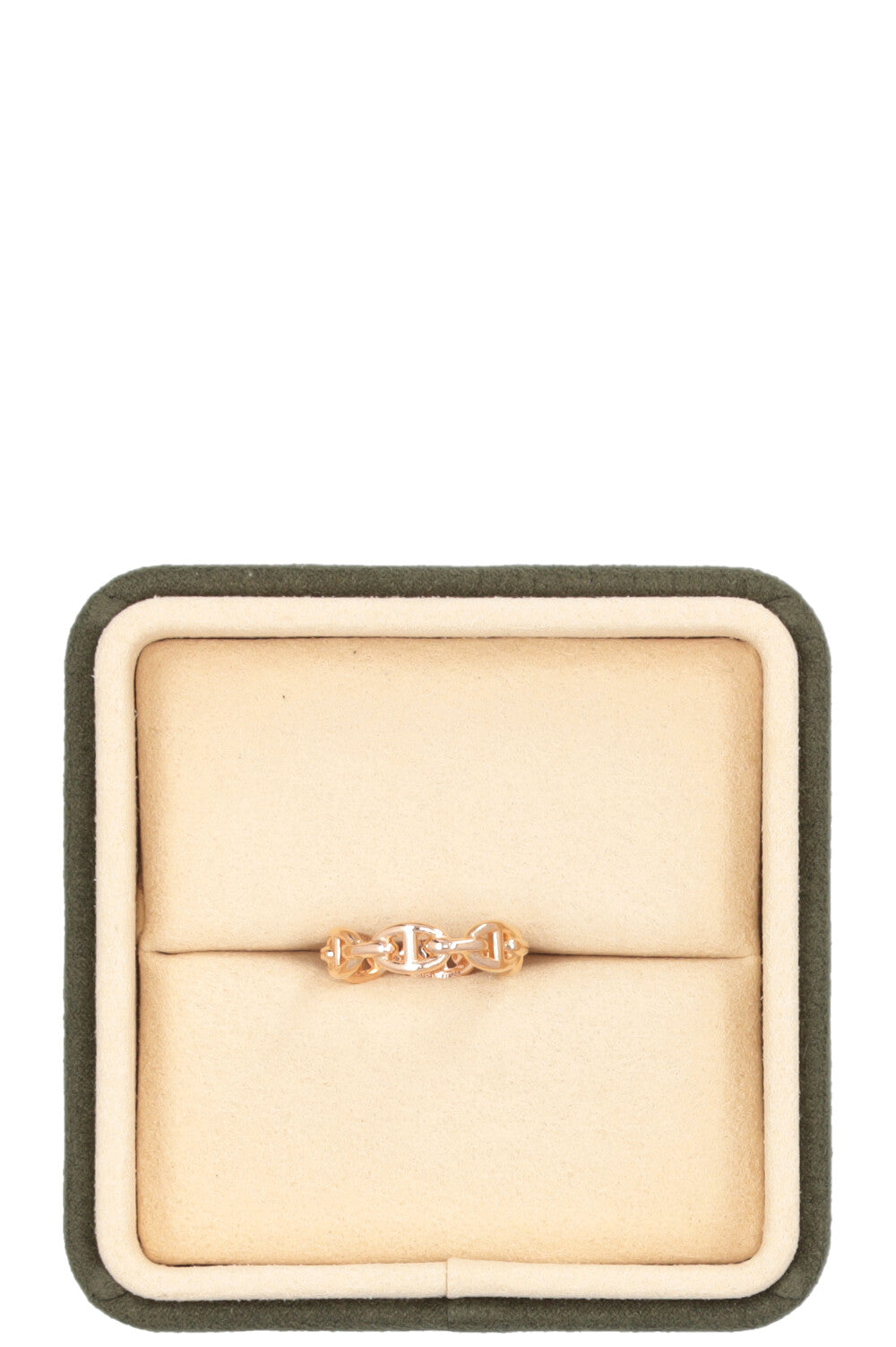 La bague Hermès Chaîne d'Ancre arbore l'un des motifs joailliers les plus emblématiques de la Maison. Confectionnée en or rose 18 carats, cette pièce d'exception met en valeur le maillon entrelacé caractéristique de la Chaîne d'Ancre. La pureté des lignes et la forme sculpturale confèrent à la bague une présence sereine et moderne, tandis que la chaude teinte de l'or rose souligne l'élégance de son design.