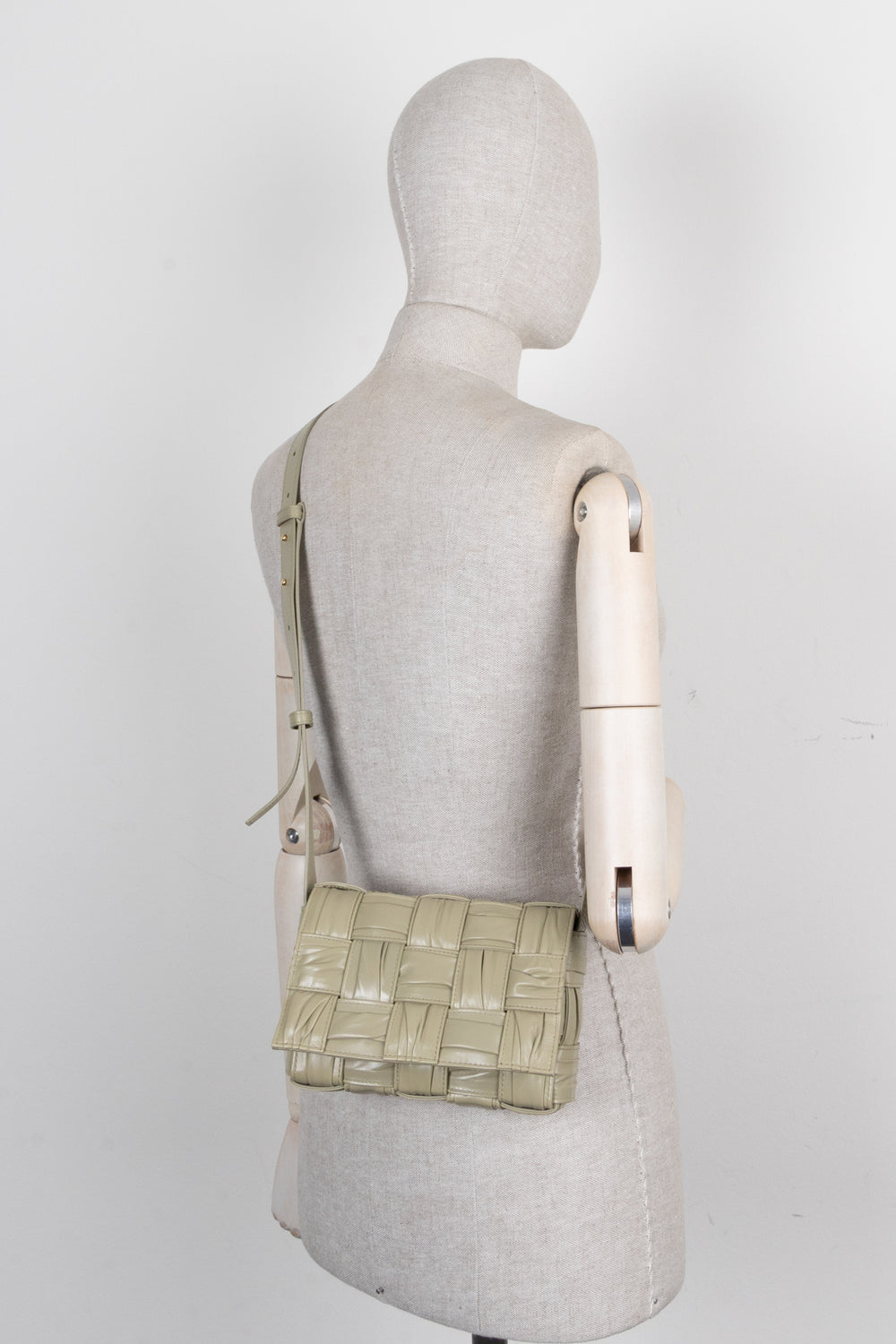 L'emblématique Cassette réinterprétée : un cuir plissé ludique dans un vert sauge doux.