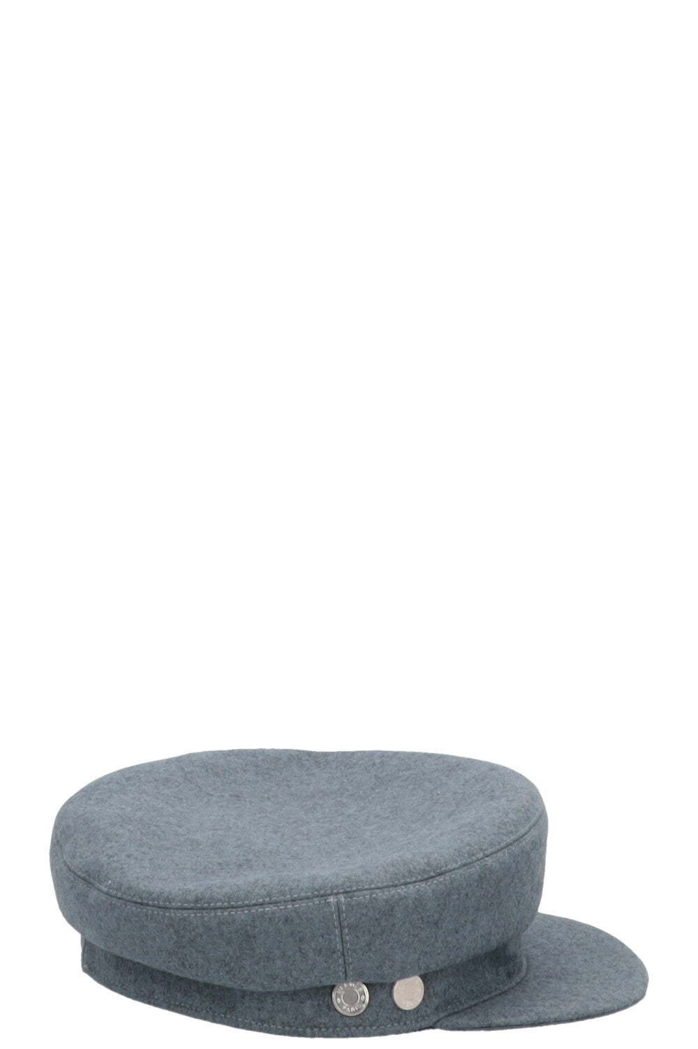 Chapeau Hermès Deauville en cachemire d'un bleu éclatant. Sur le côté droit, deux petits boutons argentés siglés Hermès viennent compléter son design classique.
