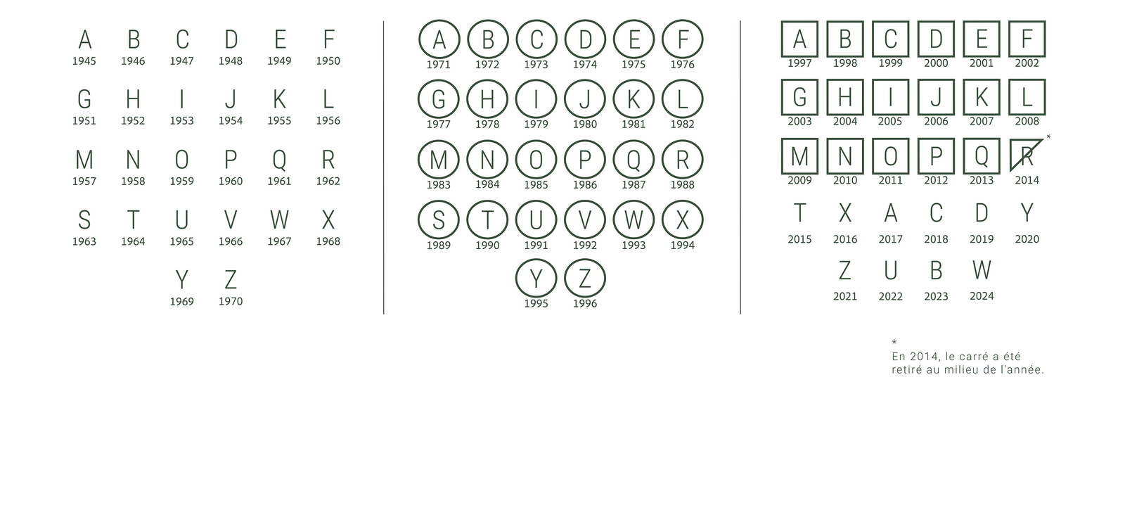 Tous les produits en cuir Hermès sont gaufrés à froid. Hermès date les sacs à main en lettres majuscules. Depuis 1971, Hermès utilise des lettres et des formes pour marquer l'année. C'est soit un cercle, soit un carré. Les modèles produits à partir de 2014 portent uniquement la lettre.