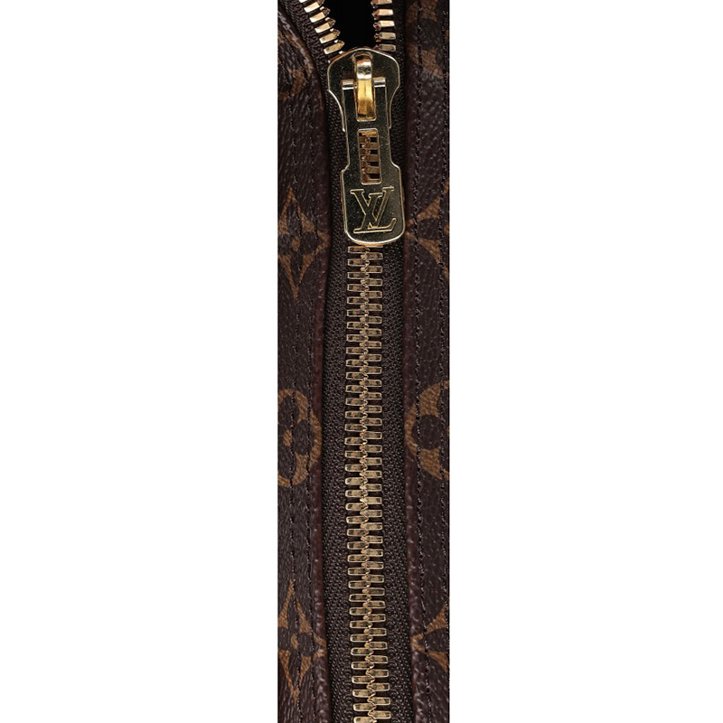La toile Monogram emblématique de Louis Vuitton, fabriquée à partir de toile enduite de vinyle, se caractérise par une surface mate, une grande flexibilité et une structure légère. En revanche, la toile non authentique présente souvent un matériau brillant, rigide et rugueux, généralement en plastique. Un regard attentif sur la ligne jaune moutarde du monogramme, qui va du bas à gauche vers le haut à droite, est décisif. Les monogrammes authentiques sont linéaires. La symétrie du monogramme, notamment au niveau des coutures, est une autre caractéristique des produits authentiques Louis Vuitton, car le "LV" n'est généralement pas coupé, sauf si cela est inévitable pour les sacs asymétriques comme le petit Bucket ou le Sac Shopping.