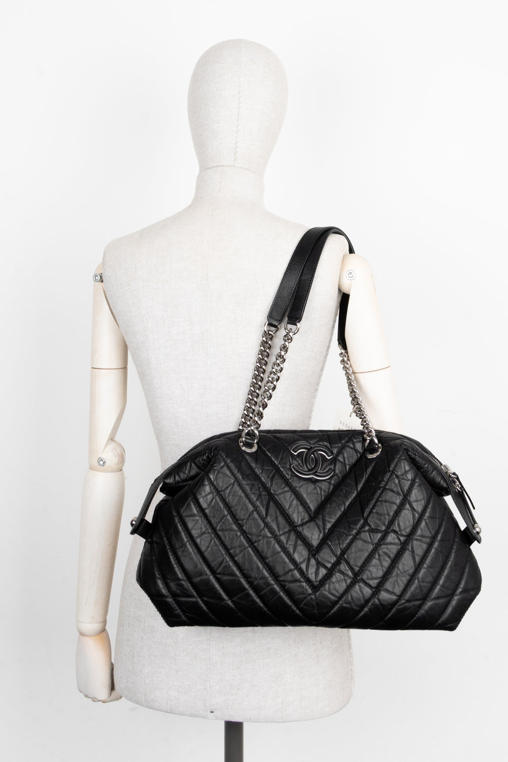 Le grand sac bowling à chevrons de Chanel en noir, réinterprète le style signature de la maison. Le cuir de veau souple présente une texture à chevrons, une variante du matelassage classique Chanel, de plus en plus présent dans les collections depuis les années 2010, offrant une alternative moderne au traditionnel motif à losanges. Son format généreux et sa forme bowling arrondie allient élégance et praticité, ce qui en fait un sac aussi bien adapté au quotidien qu'au soir. Le grand logo CC en cuir sur le devant s'impose avec audace tout en s'intégrant harmonieusement au design général. L'intérieur du sac est soigneusement conçu avec un compartiment zippé et des poches plaquées, alliant fonctionnalité et style. Les sacs bowling ont trouvé une place croissante chez Chanel dans les années 2000 et reflètent le talent de Karl Lagerfeld pour transposer les formes classiques, sportives et quotidiennes, au style de la maison. Le matelassage à chevrons, quant à lui, rappelle les éléments Art déco qui ont inspiré Coco Chanel dans les années 1930. Ce Trésor allie histoire et expression contemporaine, un sac qui incarne la polyvalence et l'histoire du design.